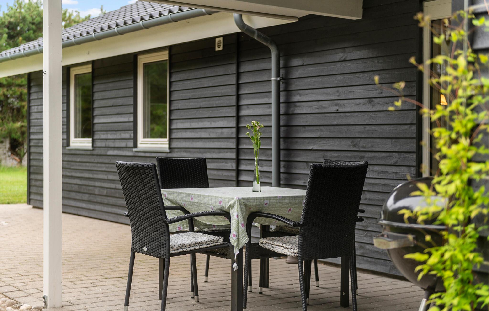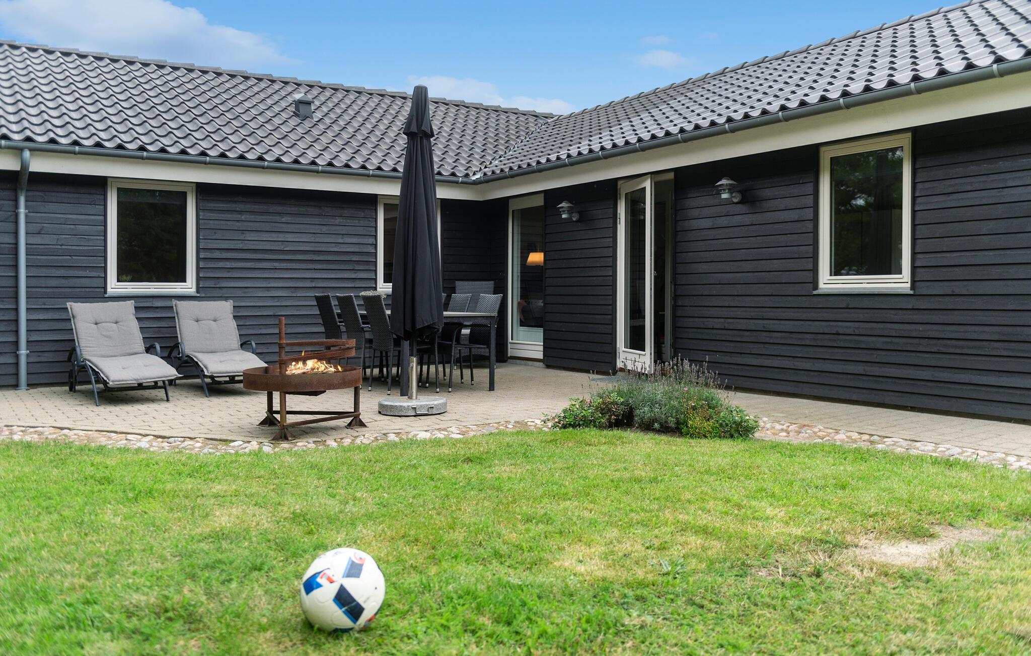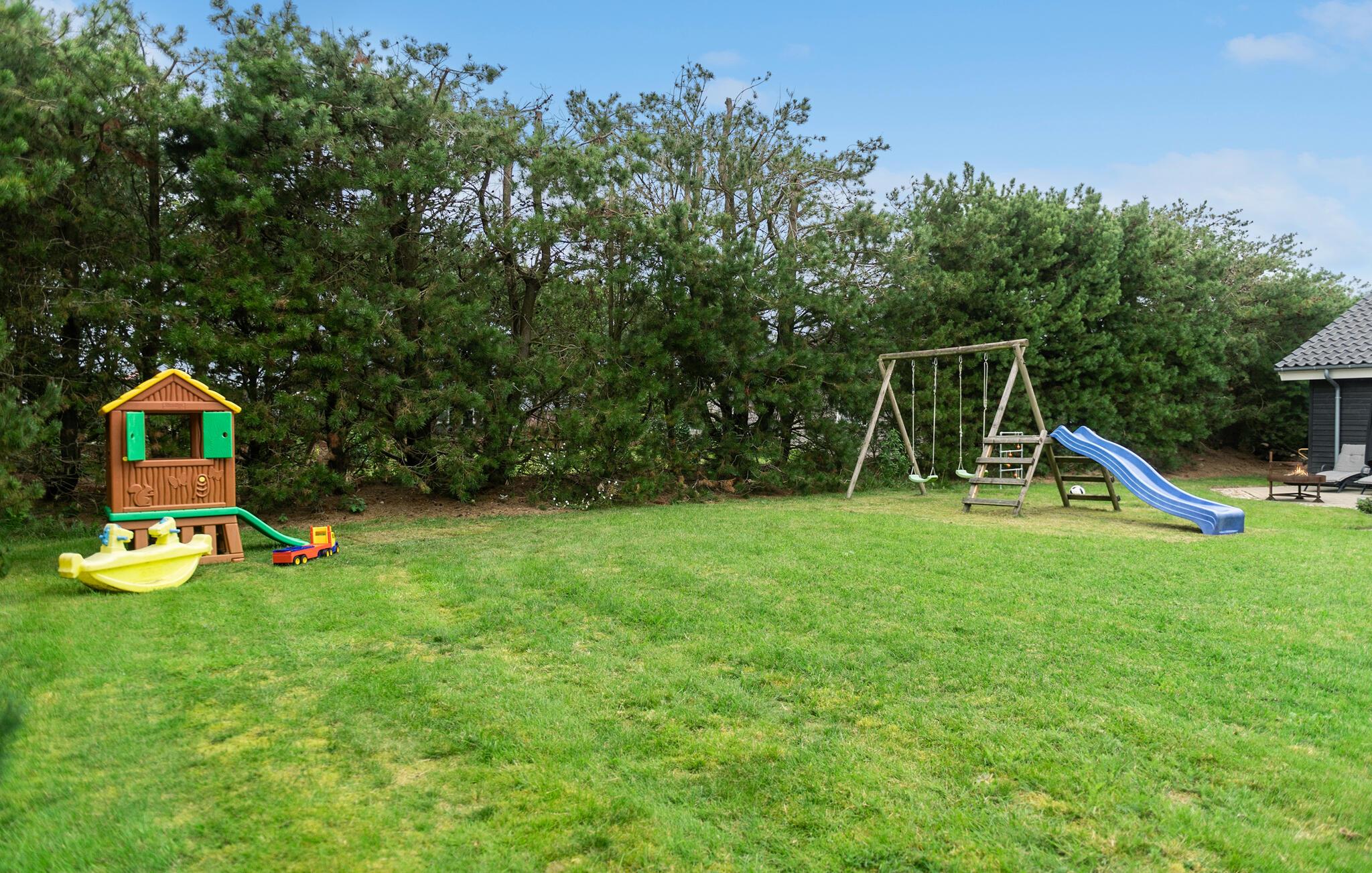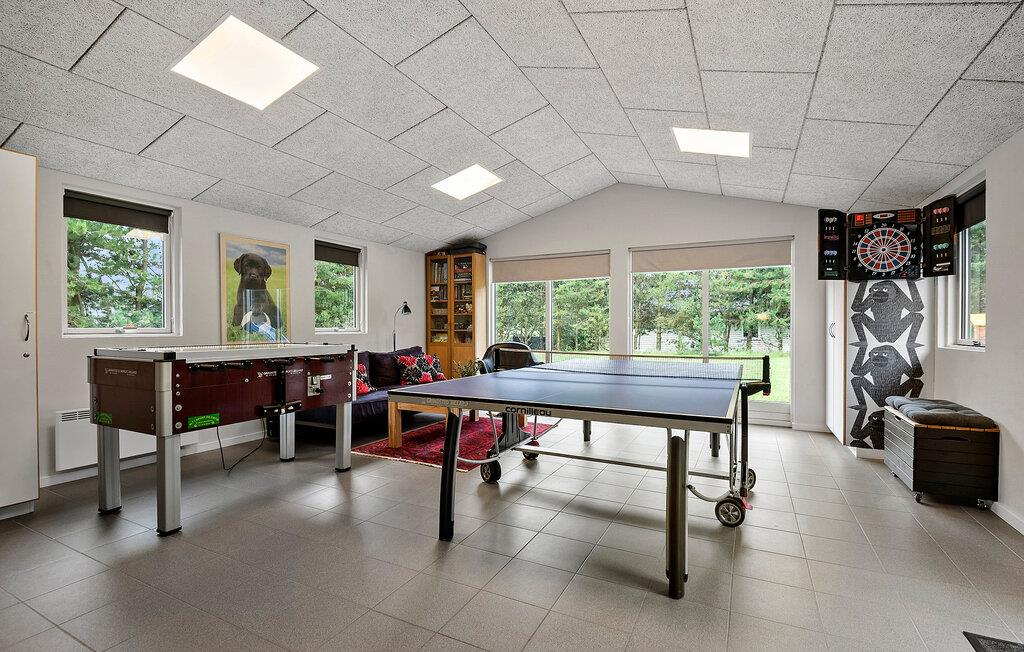 Skønt og rummeligt feriehus med et aktivitetsrum for hele familien med bordtennis, bordfodbold samt dart. Huset er lyst og venligt indrettet og fra det rummelige køkken/alrum, er der adgang til den dejlige terrasse, hvor I kan nyde solen. I køkkendelen er der installeret gulvvarme. Feriehuset har to gode badeværelser, hvoraf det ene er indrettet med et stort spabad samt adgang til sauna. Mens I sidder og slapper af på terrassen, kan børnene lege på grunden, hvor der findes aktiviteter for de mindste.