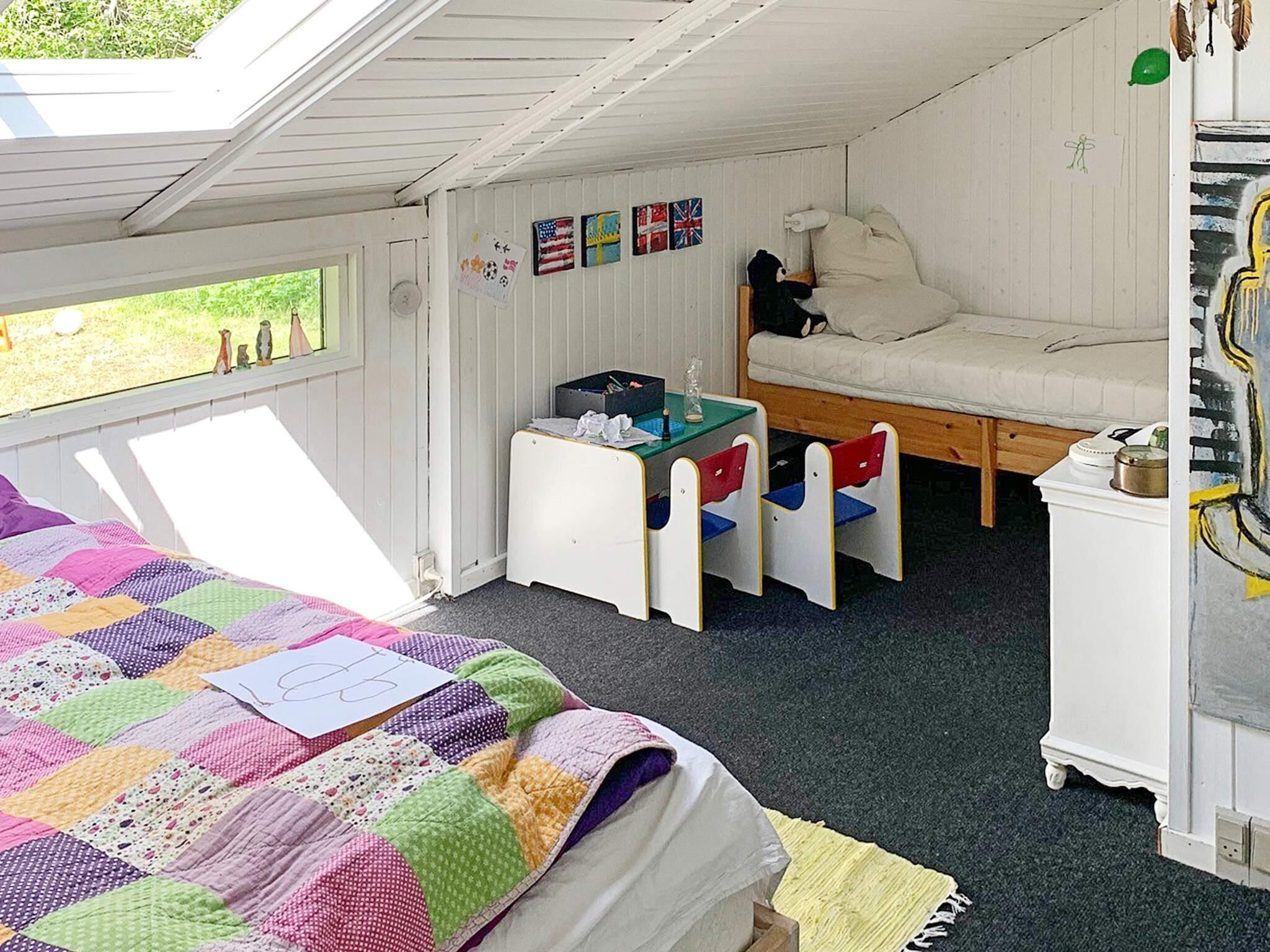 Ejendommen har tre soveværelser: et med dobbeltseng, et andet med både en dobbeltseng og en enkeltseng og et tredje med en enkeltseng og en barneseng. Derudover indeholder stuen en sovesofa, der kan sove yderligere to gæster, hvilket giver huset fleksible sovemuligheder for familier og grupper. Et moderne badeværelse med gulvvarme giver ekstra komfort og bekvemmelighed.