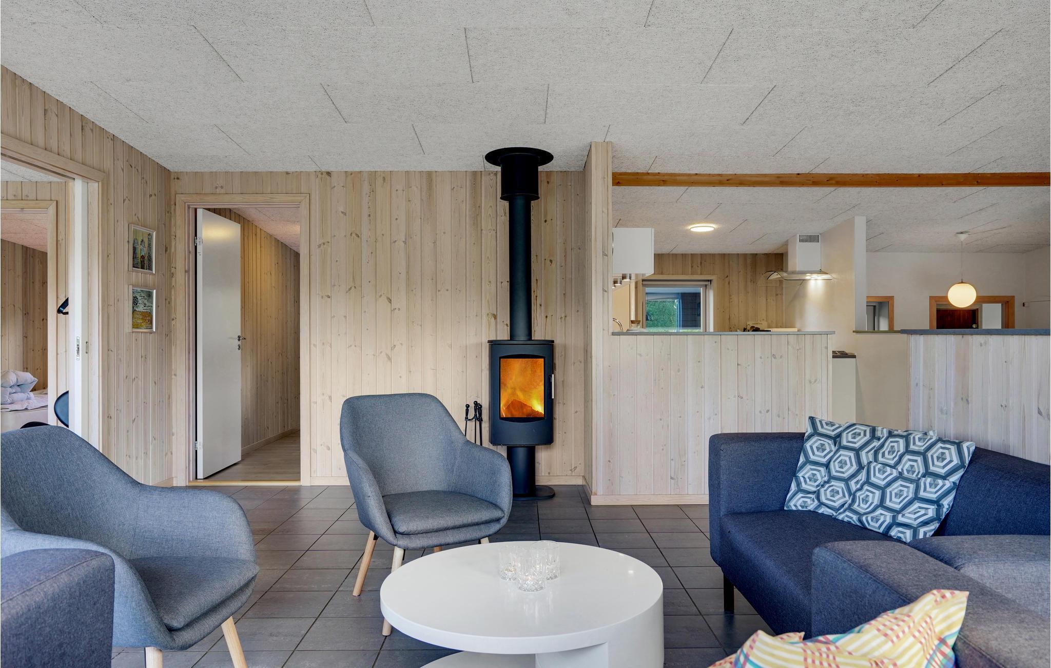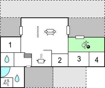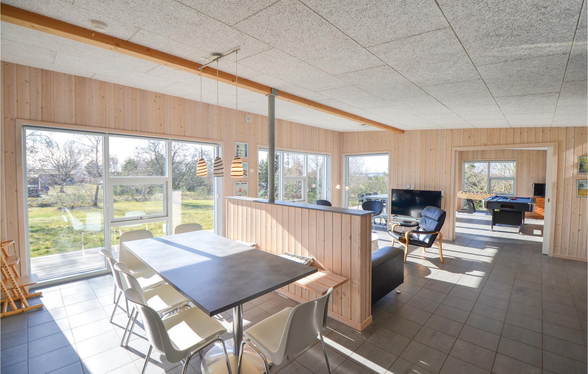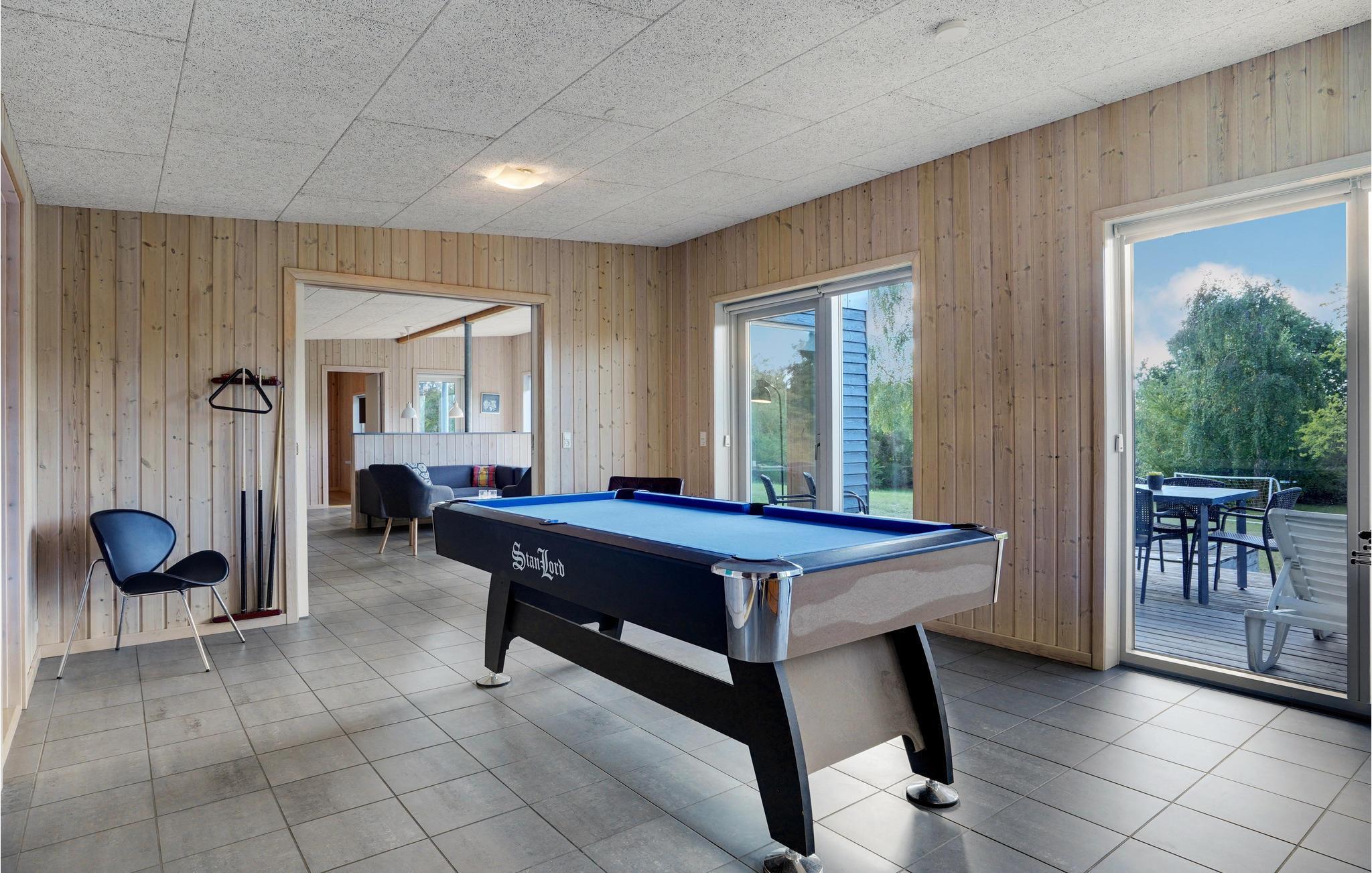 I såvel materialevalg, indretning, arkitektur og interiør er feriehuset kvalitetsmæssigt gennemført. I det skønne hus er der masser af plads til at to familier kan holde en dejlig ferie sammen. Det er indrettet med et flot køkken/alrum, fire soverum med gode senge samt to lækre badeværelser, hvoraf det ene indeholder et herligt spabad til to pers. samt en sauna. I aktivitetsrummet er der mulighed for dyst i bl.a. bordfodbold og pool. DVD kan afspilles på Playstation. Udendørs venter de store terrasser, hvor I kan nyde freden og roen. Der er gåafstand til den børnevenlige strand. 5 min. kørsel til Ebeltoft