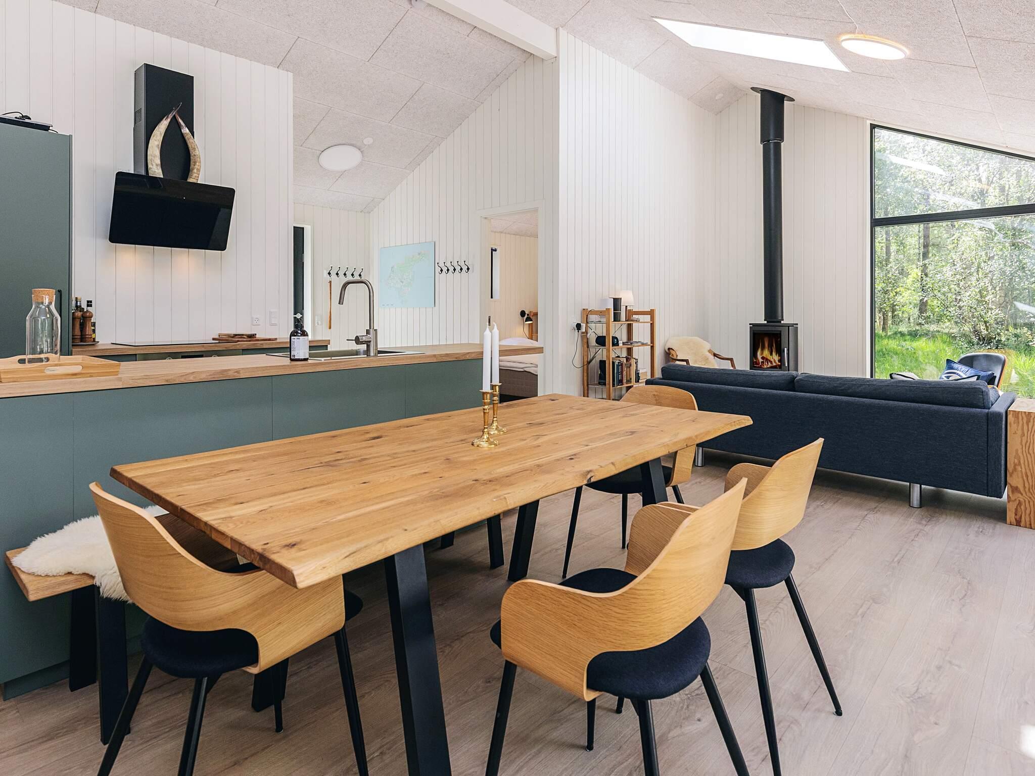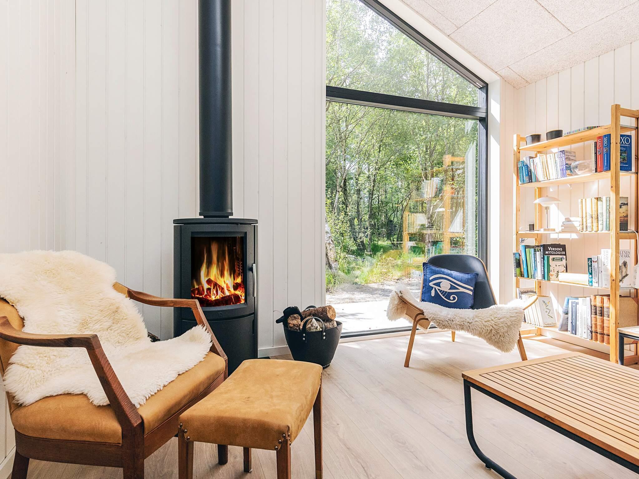 Det moderne feriehus er praktisk indrettet og smagfuldt og gennemtænkt indrettet. Den består af en stue med store vinduespartier, der giver et skønt lysindfald. Opholdsstuen har brændeovn og der er åbent køkken i forbindelse med spisestuen, 3 rummelige soveværelser og badeværelse med behagelig gulvvarme. Der er også en god hems med madrasser, hvor de større børn i familien kan trække sig tilbage og få lidt fred og ro.