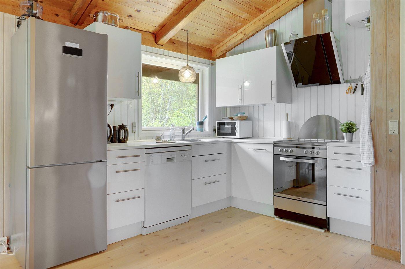Køkkenet er udstyret med 1 køleskab. Der er 4 keramiske kogeplader, varmluftovn, mikrobølgeovn samt opvaskemaskine.