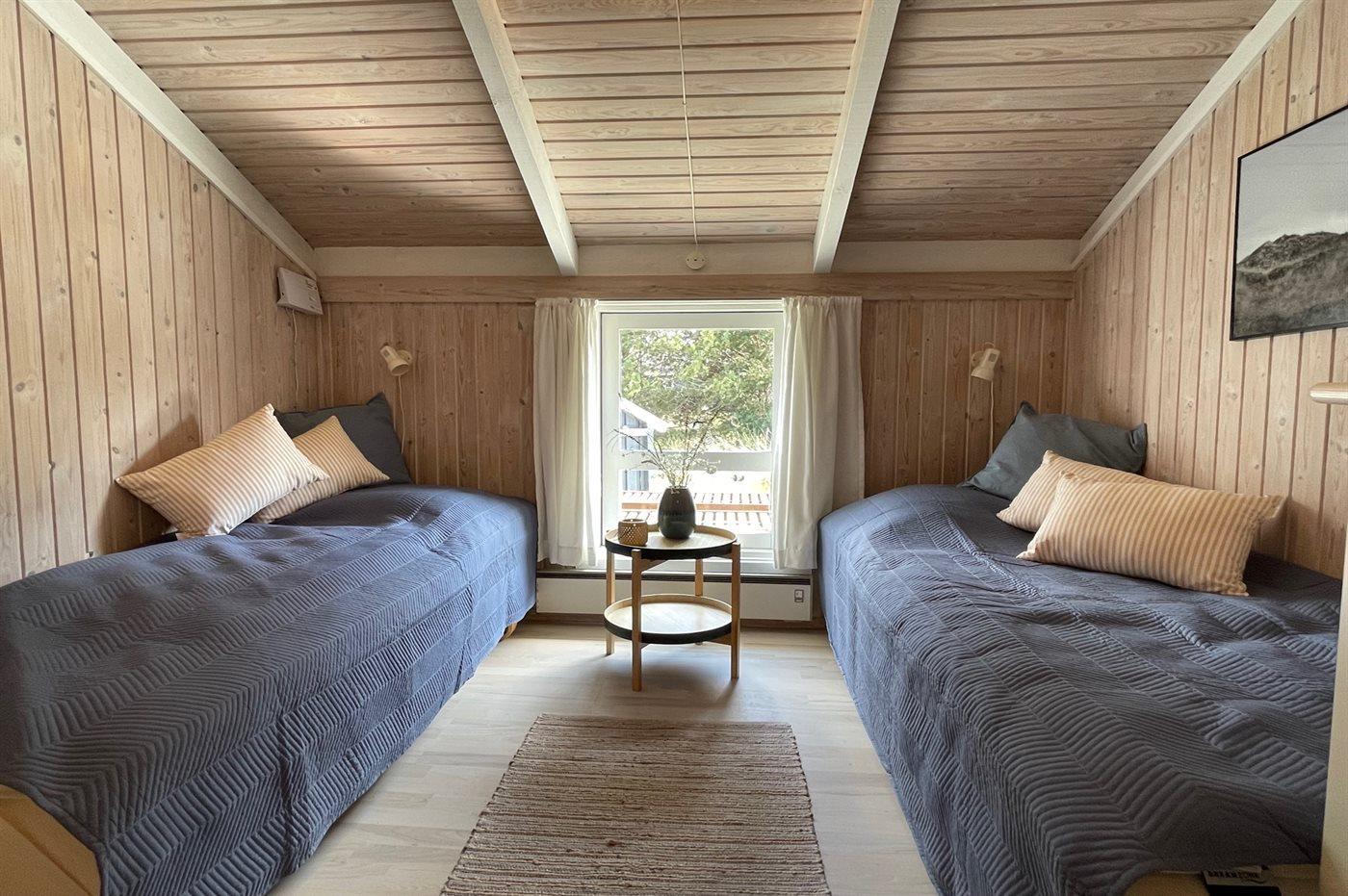 Der er i alt 2 soveværelser. Sovepladserne fordeler sig på: 2 sovepladser i dobbeltseng. 2 sovepladser i enkeltsenge. 1 soveplads på madras. 1 af disse sovepladser befinder sig på husets hems. Derudover er der 1 stk. barneseng.