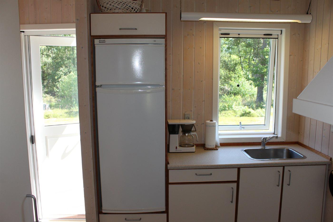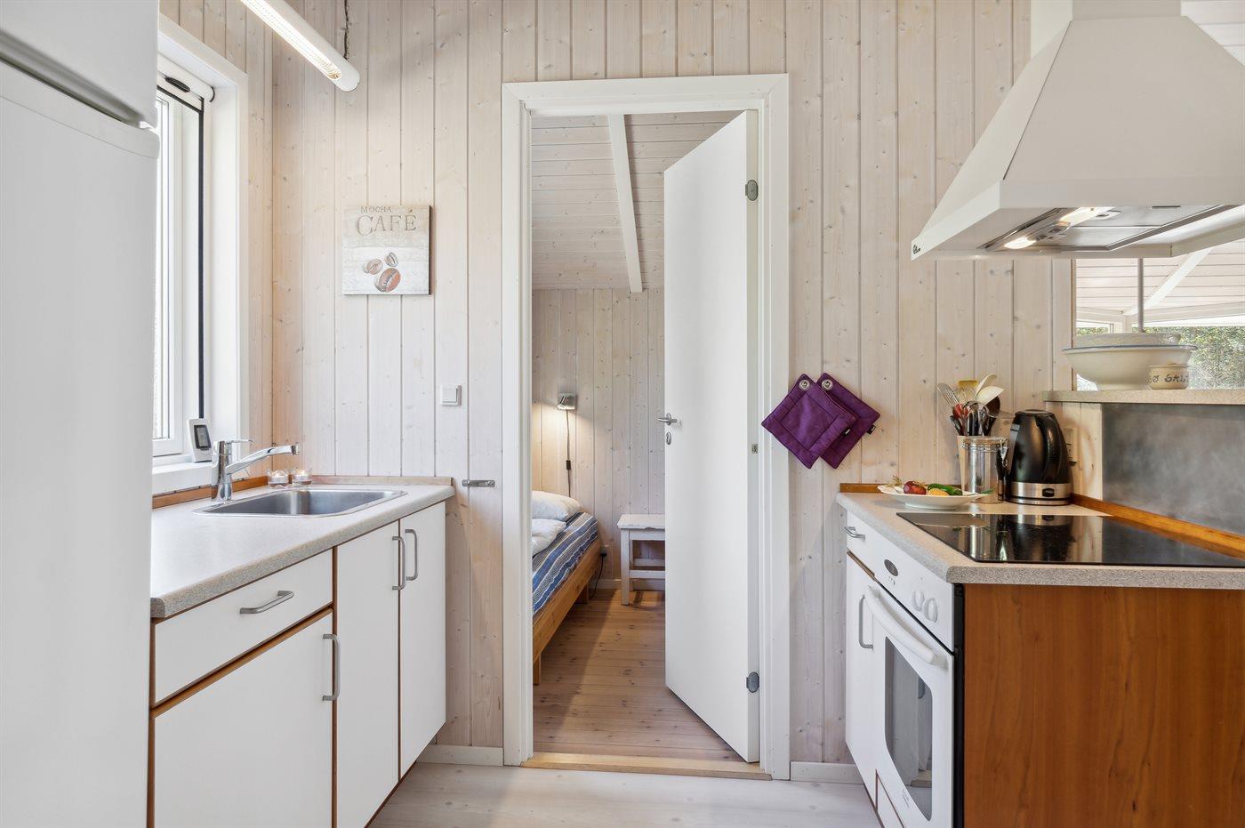 Køkkenet er udstyret med 1 køleskab. Der er 4 keramiske kogeplader, bageovn, varmluftovn.
