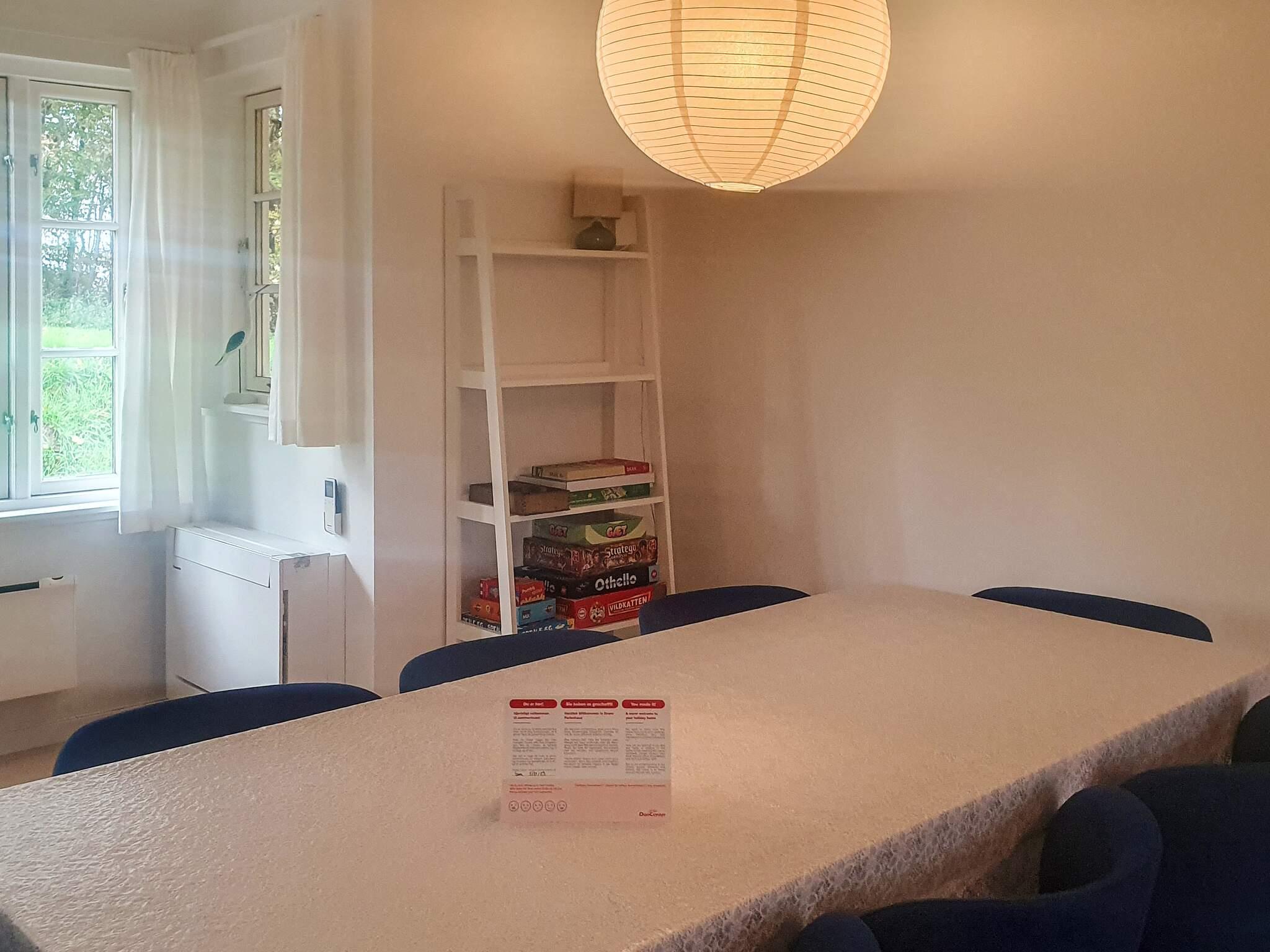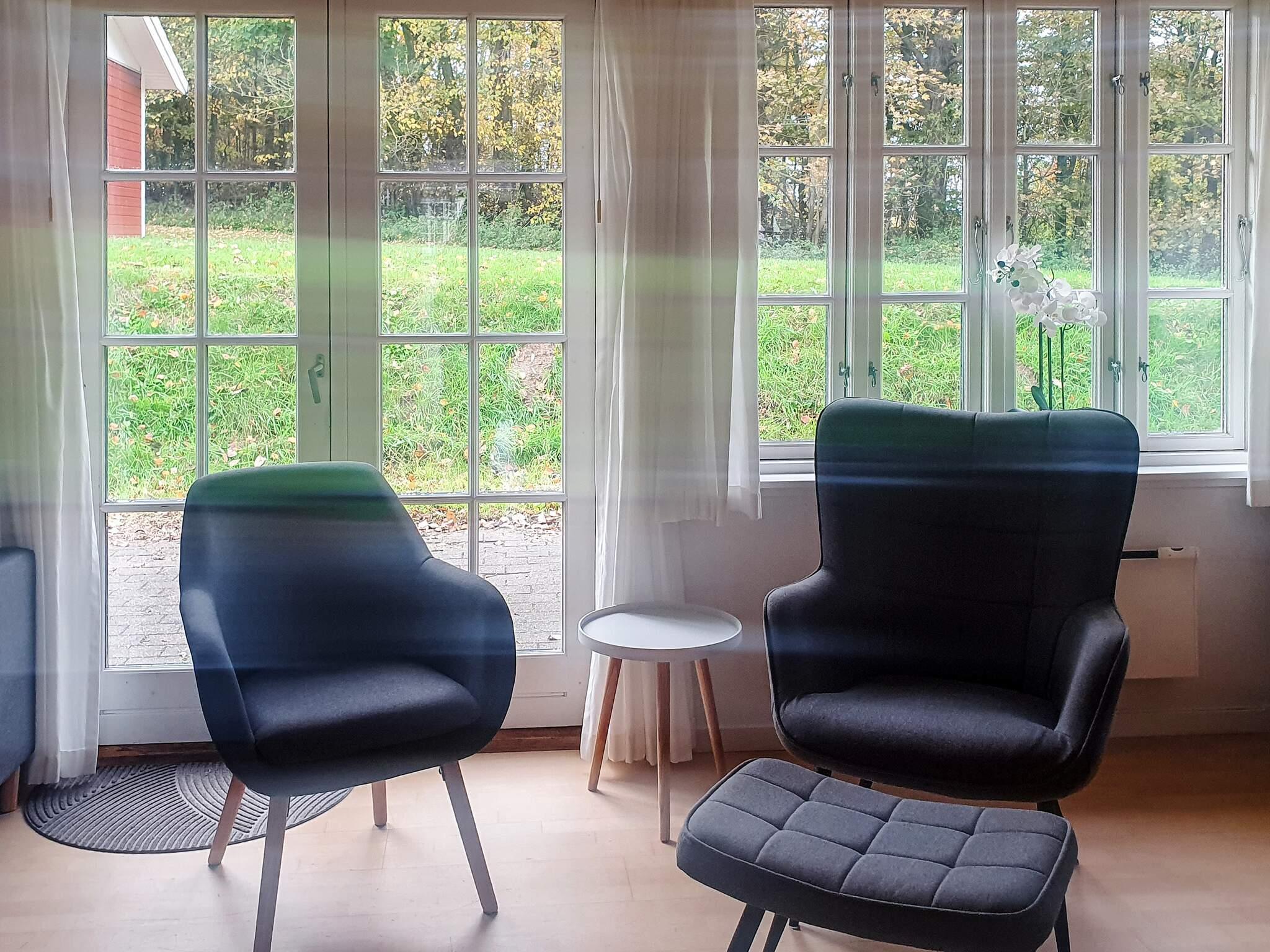 I stuen er der spisebord med 8 spisepladser. Der er en 3 personers sofa og tre lænestole. Vær opmærksom på, at hvis i kommer 8 personer, så kan ikke alle 8 sidde i sofagruppen samtidigt.