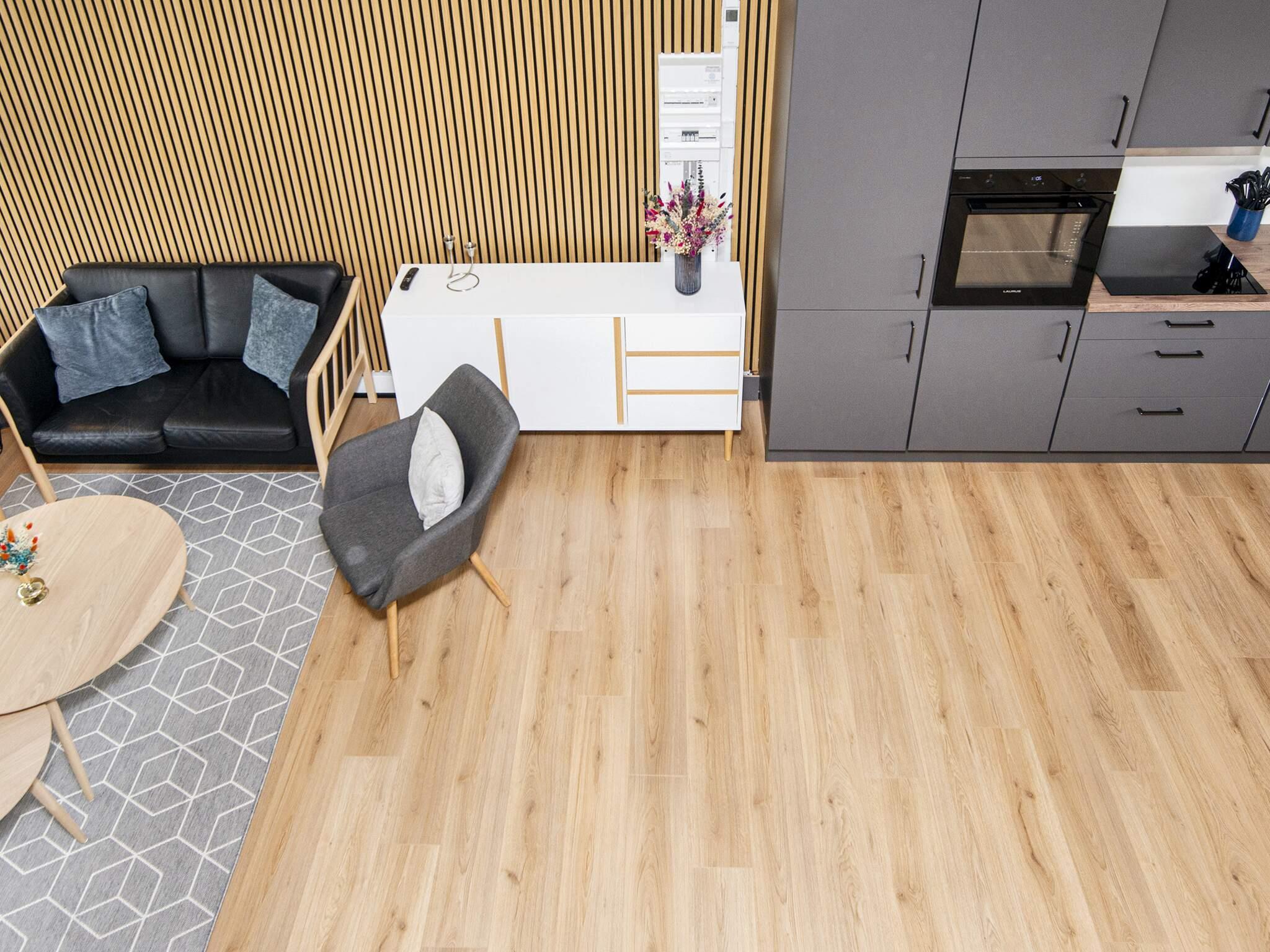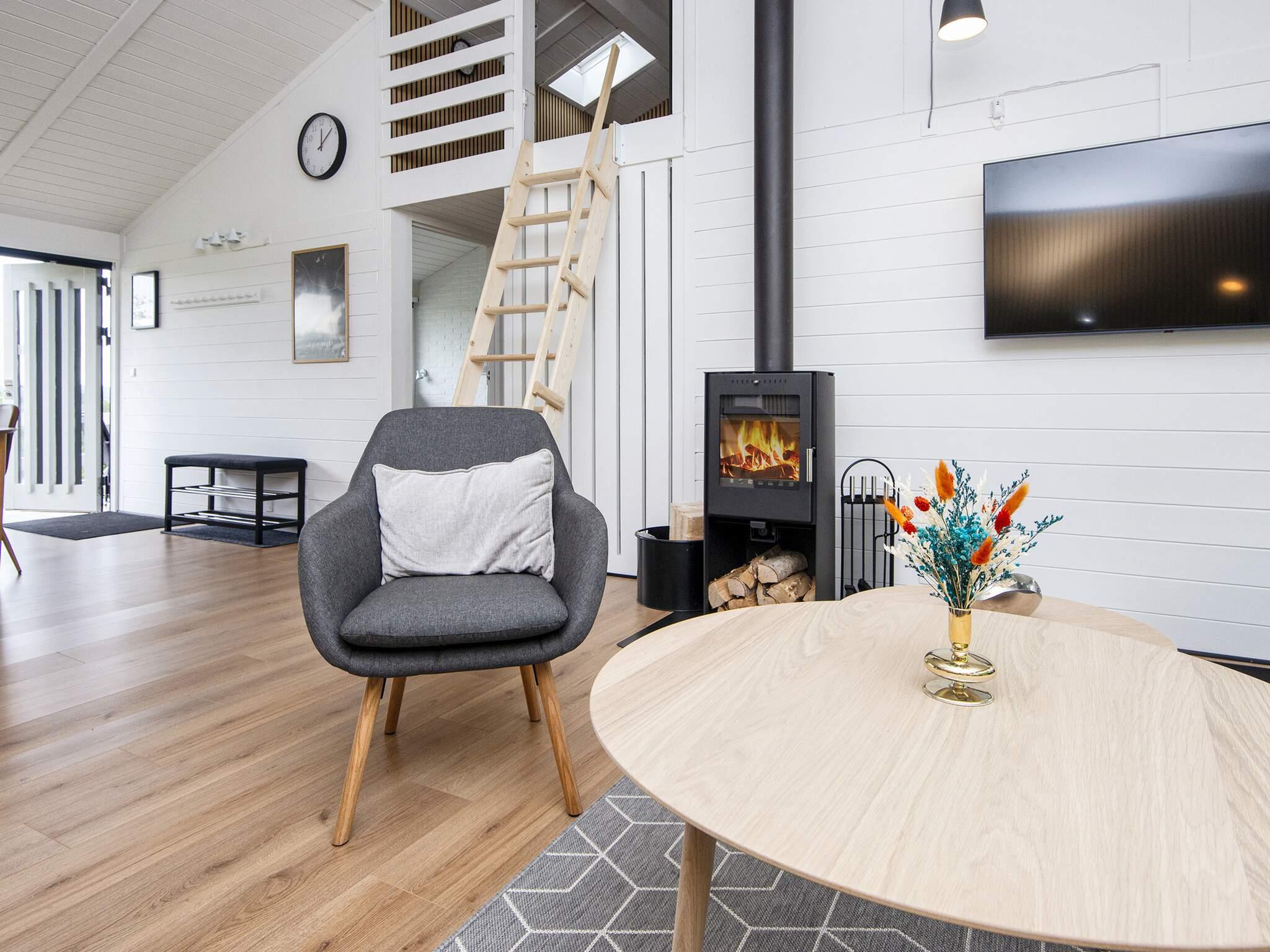 I foråret 2024 har husejer sammenlagt køkken og opholdsstuen, så I får et stort køkken/alrum, hvor lysindfaldet herved at blevet endnu større. Der er lagt nye trægulve og alt er blevet malet lyst. Huset indeholder desuden en weekendseng og en høj stol.