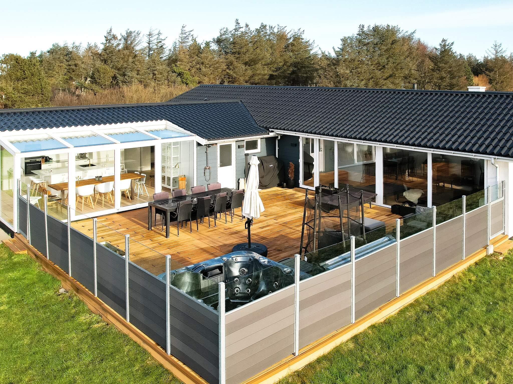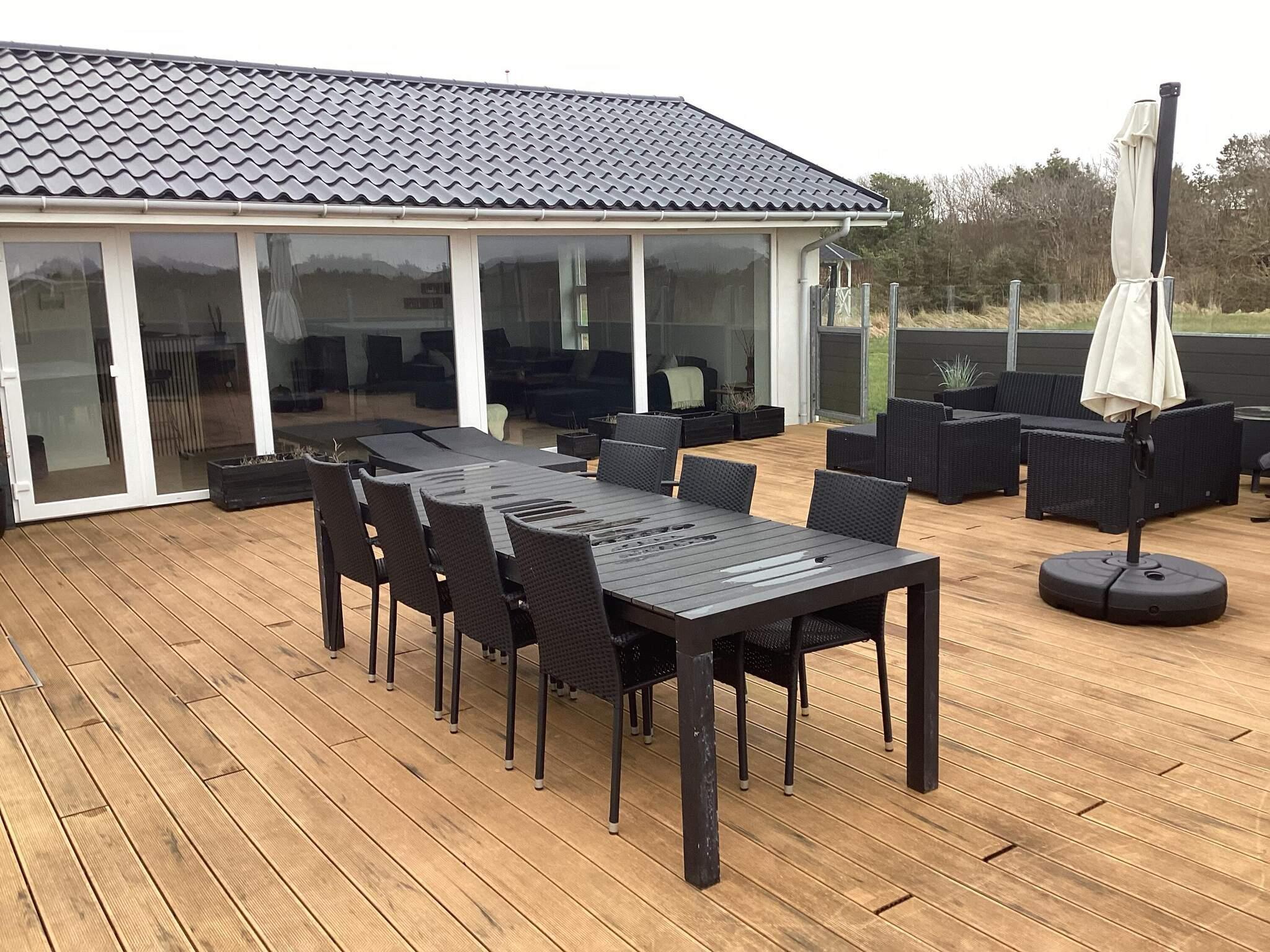 Alrummet/køkkenet og stuen åbner ud til en stor, indhegnet terrasse, hvor der er et havebord med spisebord og stole, samt et sofasæt med plads til hyggeligt samvær, liggestole, en udendørs bruser (lukket fra oktober til april pga. risiko for frostskader), samt et stort udendørs spabad med plads til 8 personer. Til ejendommen hører desuden en carport, hvorfra man kan komme ind i huset uden at få våde fødder.