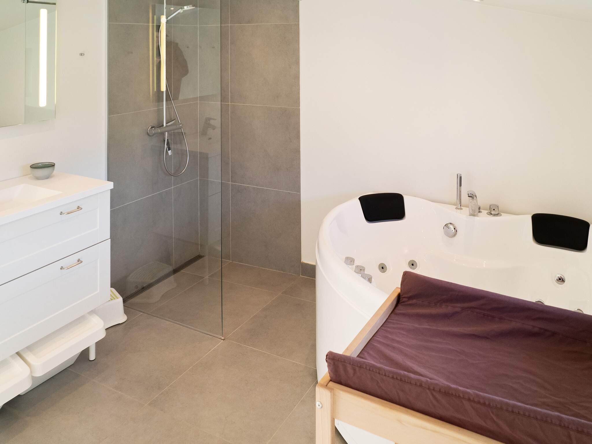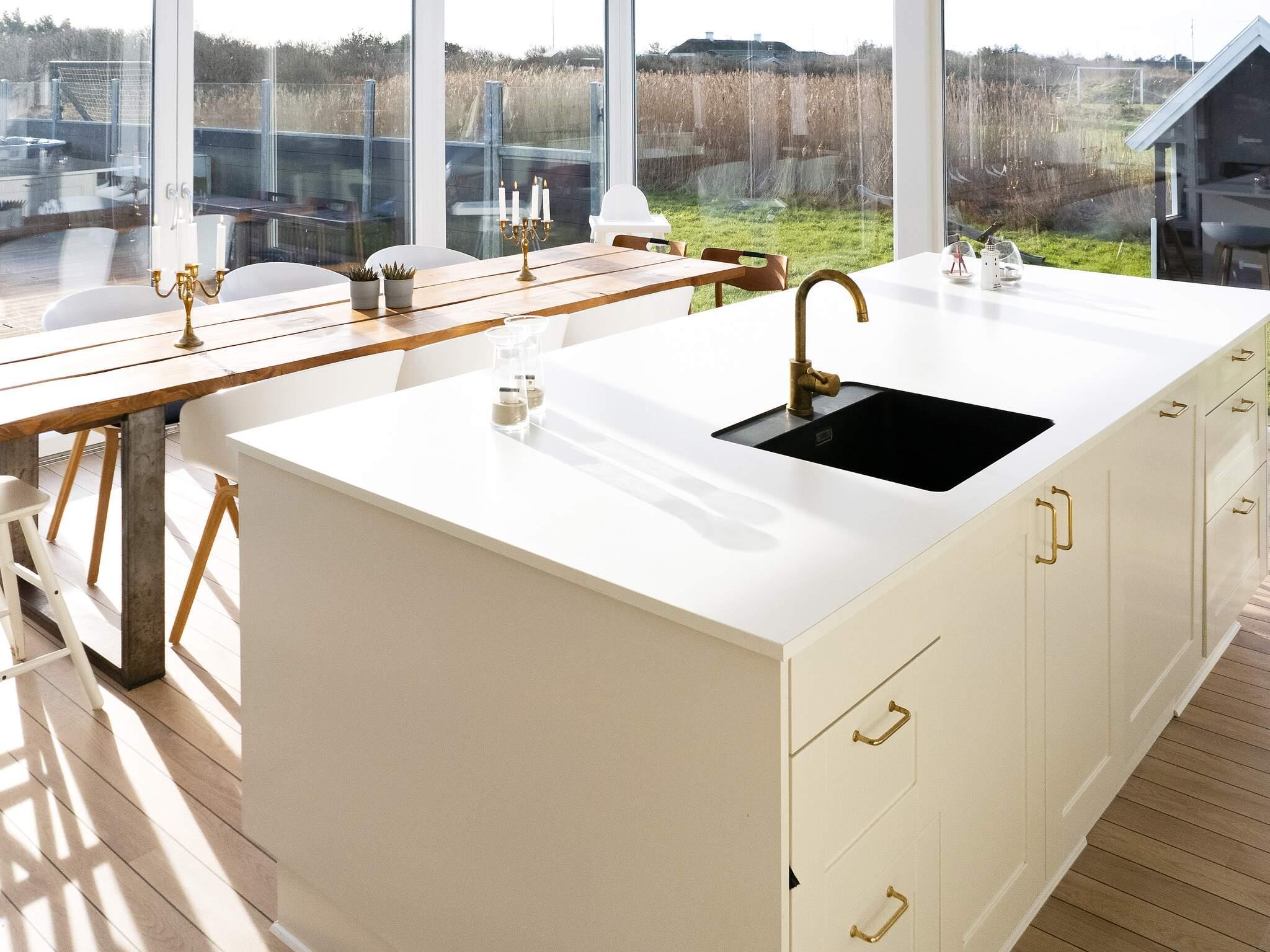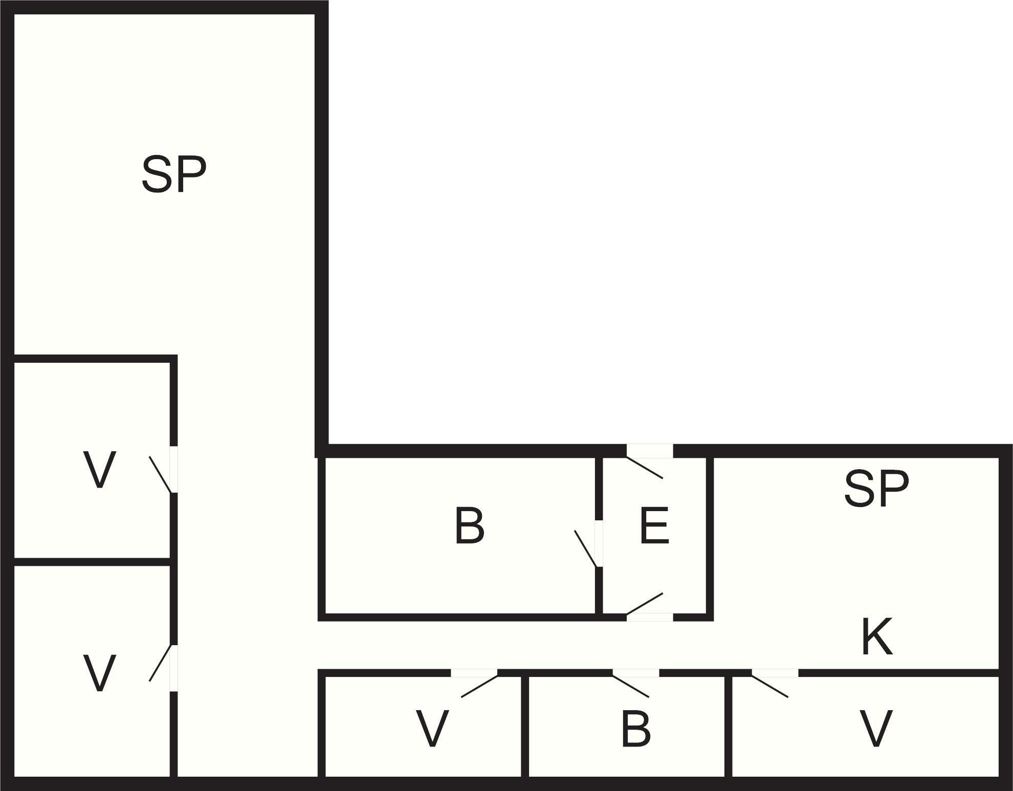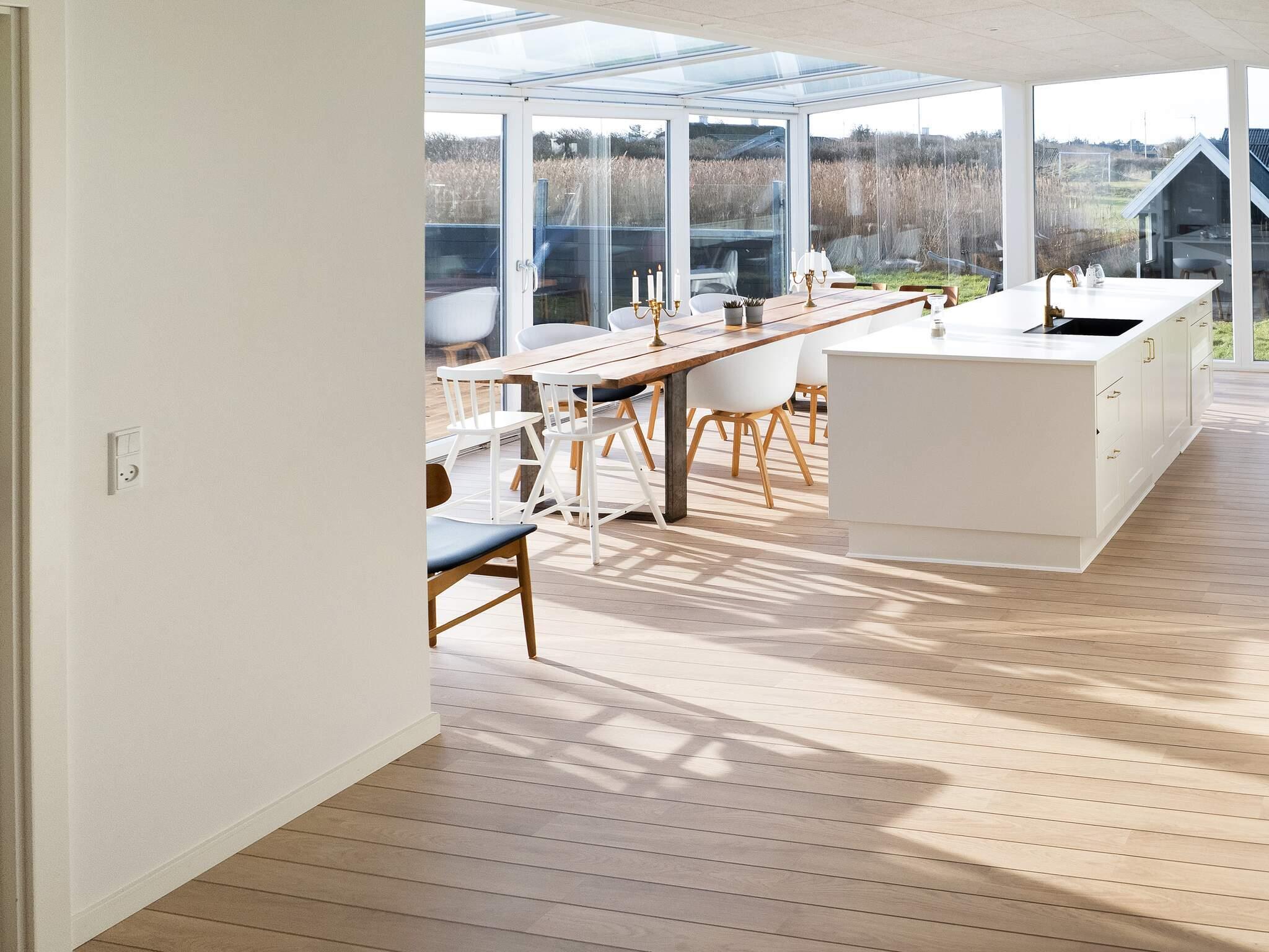 Fra entréen er der adgang til stort køkken/alrum, hvorfra der er adgang til yderligere to soveværelser med dobbeltsenge, badeværelse med brus, samt stort wellness-badeværelse med bruser og spabad til to personer. Bryggers med vaskemaskine og tørretumbler og sidst men ikke mindst husets hjerte i form af den store opholdsstue med køkken, som har plads til hele familien.
