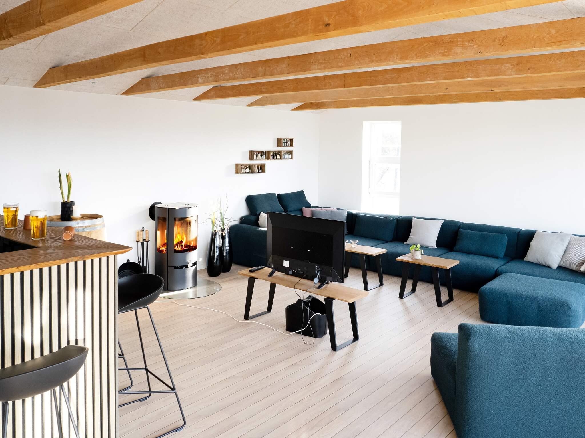 Stor entré med adgang til to lyse soveværelser med dobbeltsenge og stor stue med højt til loftet og synlige bjælker, brændeovn, samt luft-til-luft varmepumpe. Endvidere er stuen indrettet med bar og hyggehjørne med sofagruppe og TV. Der er ingen kabelpakke, men det er muligt at streame egne streamingtjenester osv. via den installerede Chromecast.
