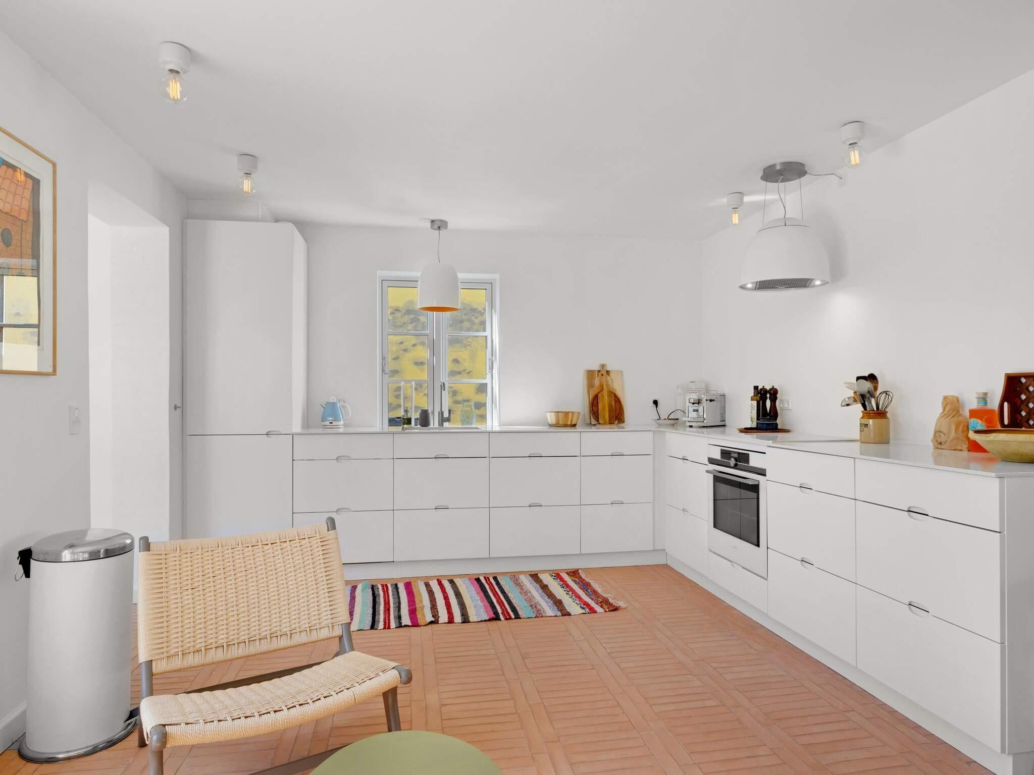 The kitchen and living room form a large and charming space that creates a perfect atmosphere for getting together while cooking and indoor coziness. The bright kitchen is furnished with care and offers plenty of space to prepare delicious meals together. Next to the kitchen you will find the dining area with room for 8 people along the fine table with bench.