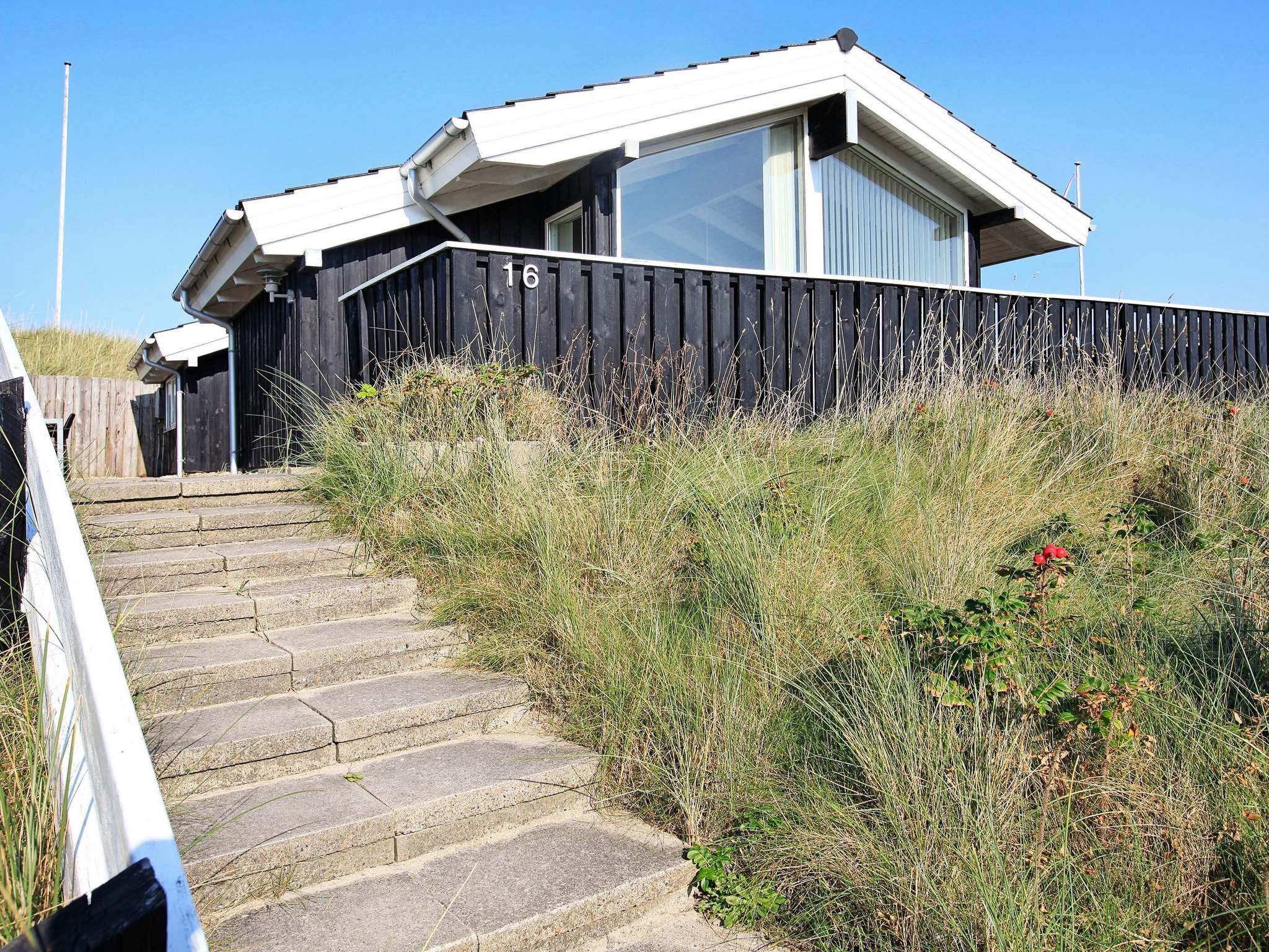 Velholdt sommerhus med smagfuld, moderne indretning, lyse rum og flere terrasser. Huset ligger på en kuperet fælles klitgrund kun ca. 200 m fra hav og strand ved Løkken Syd. Fra stue og terrasse er der en flot udsigt over klitområdet. Huset indeholder stue i åben forbindelse med køkken, et soverum med dobbeltseng, et soverum med to enkeltsenge, alkove med dobbeltmadras, hems med to madrasser, badeværelse med gulvvarme, spabad og adgang til sauna, entre. Indretningen er med moderne møblement i den kendte danske sommerhusstil. Huset har både en luft/luft varmepumpe og en brændeovn til hygge og billig opvarmning. Mod øst, syd og vest er der ca. 60 m² terrasseareal, heraf en lille del overdækket. Udlejes ikke til ungdomsgrupper.