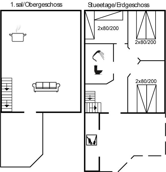 Der er i alt 3 soveværelser. Sovepladserne fordeler sig på: 4 sovepladser i dobbeltsenge. 2 sovepladser i enkeltsenge. 2 sovepladser på madrasser. 2 af disse sovepladser befinder sig på husets hems. Derudover er der 1 stk. barneseng.