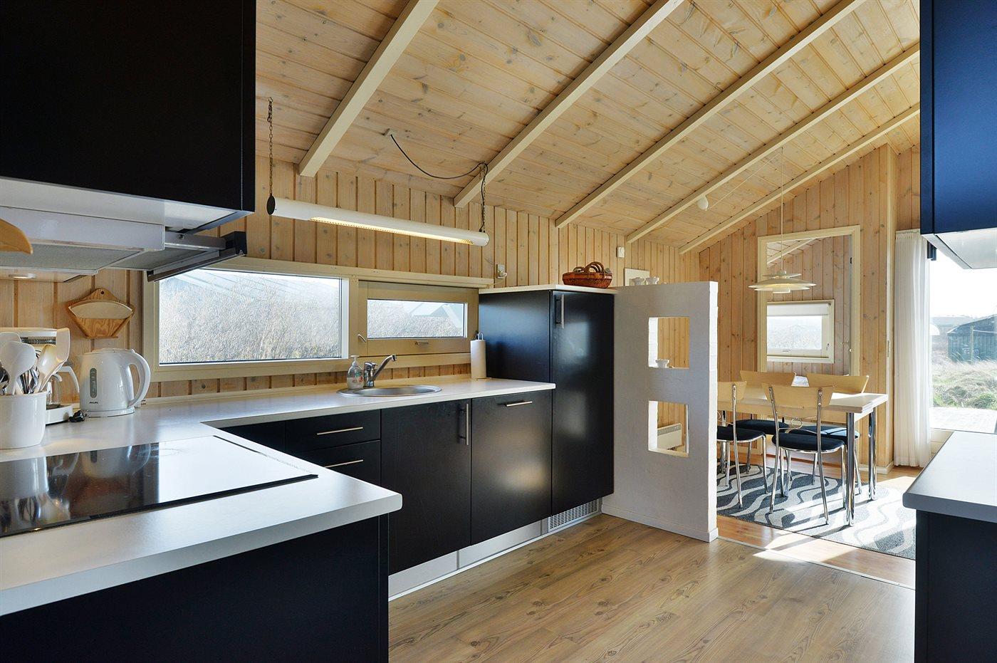 Køkkenet er udstyret med 1 køleskab. Der er 4 keramiske kogeplader, varmluftovn samt opvaskemaskine.