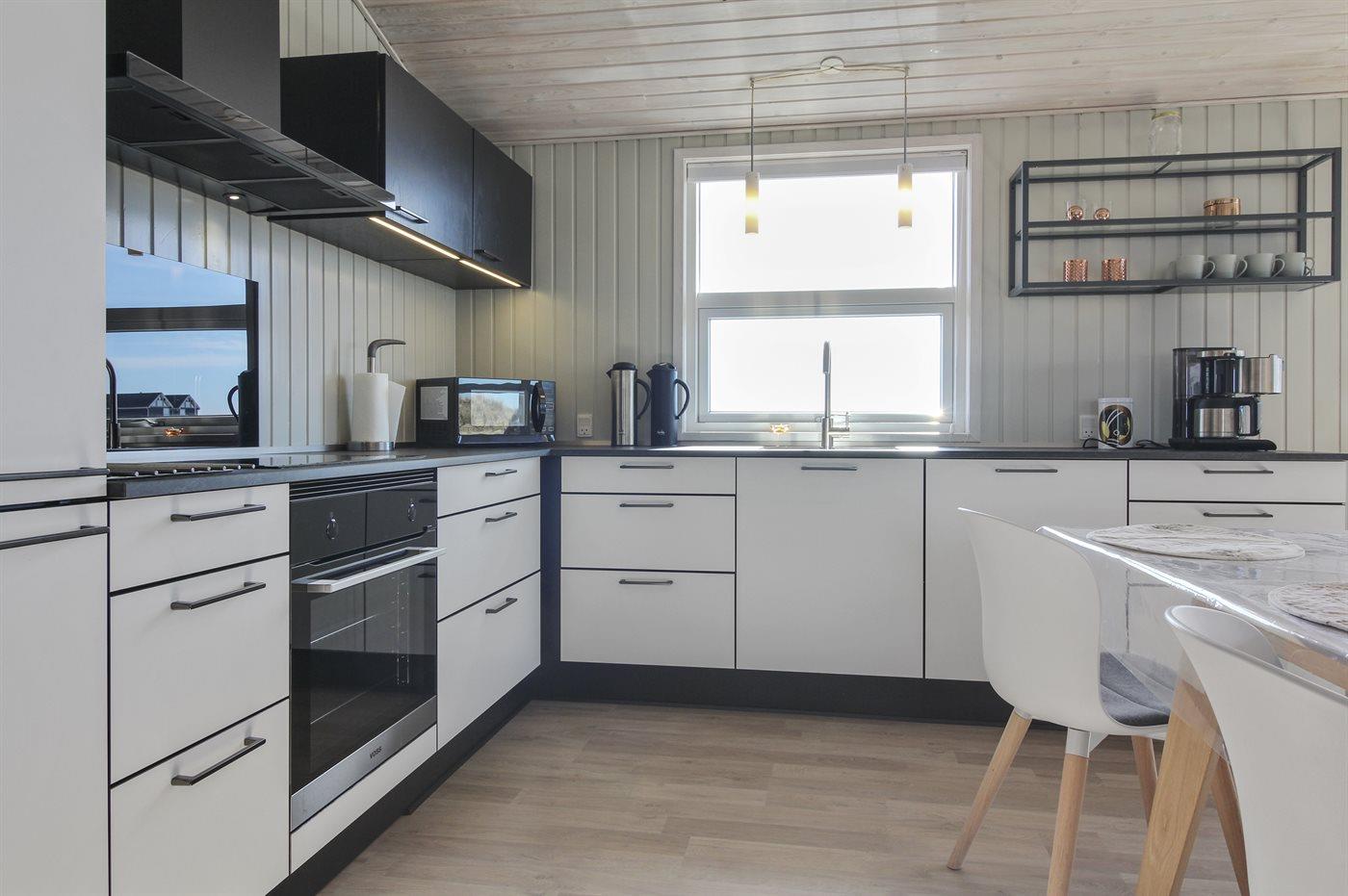Køkkenet er udstyret med 1 køleskab. Der er 4 keramiske kogeplader, varmluftovn, mikrobølgeovn samt opvaskemaskine.