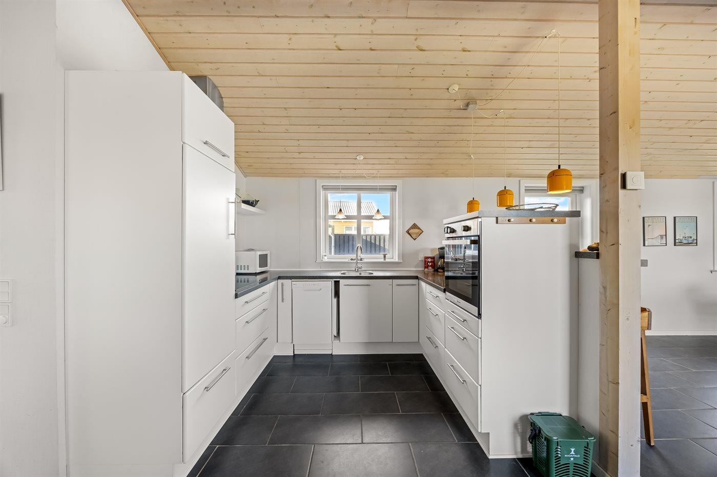 Køkkenet er udstyret med 1 køleskab. Der er 4 keramiske kogeplader, varmluftovn, mikrobølgeovn samt opvaskemaskine Der er gulvvarme i køkkenet.