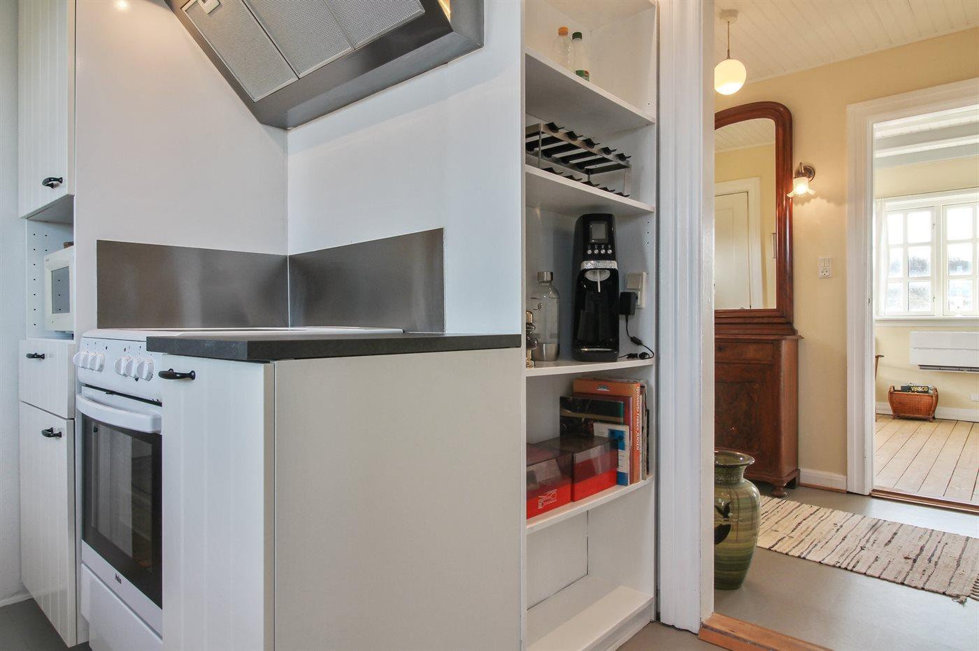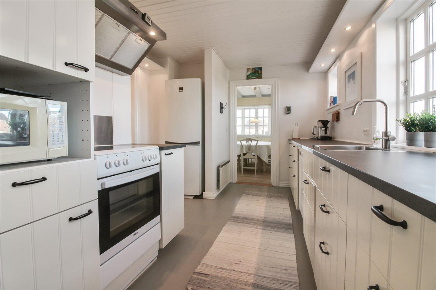Køkkenet er udstyret med 1 køleskab. Der er 4 keramiske kogeplader, varmluftovn, mikrobølgeovn samt opvaskemaskine.