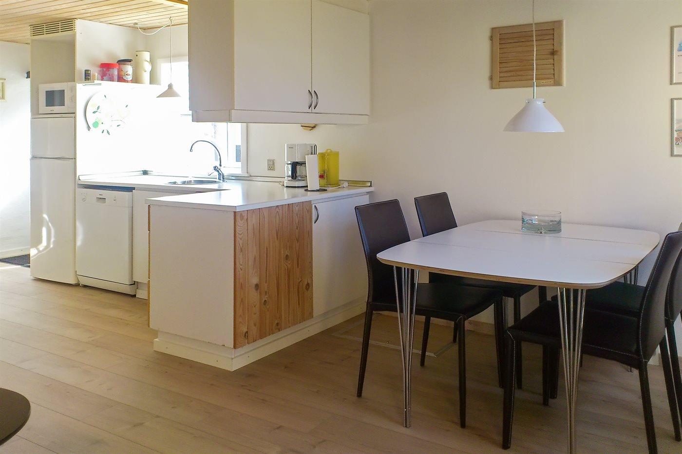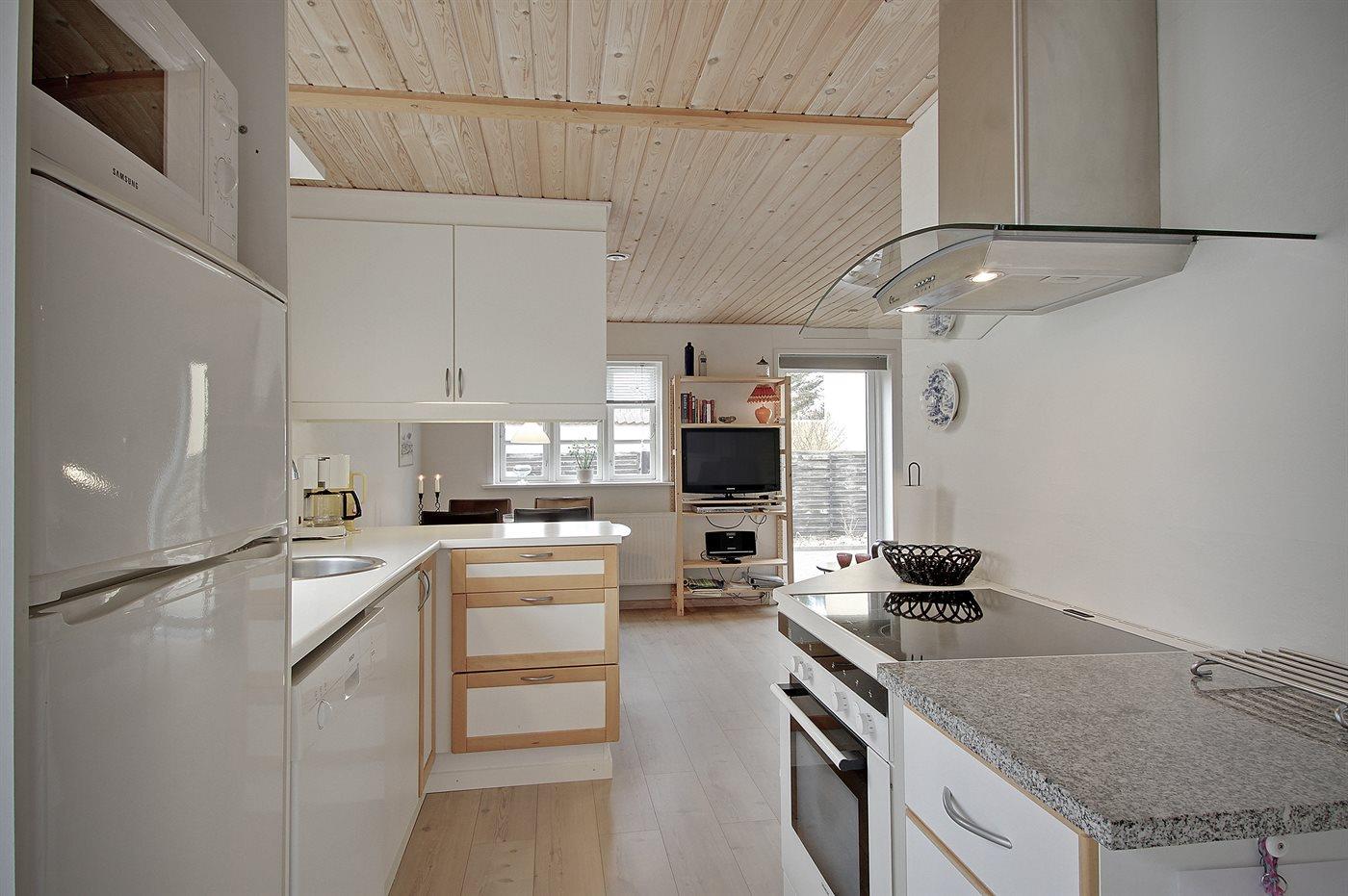 Køkkenet er udstyret med 1 køleskab. Der er 4 keramiske kogeplader, varmluftovn, mikrobølgeovn samt opvaskemaskine.
