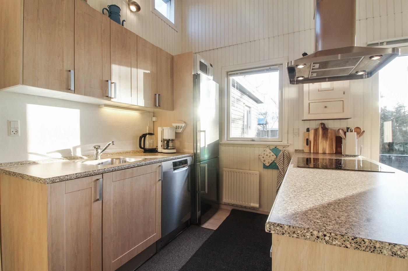 Køkkenet er udstyret med 1 køleskab. Der er 4 keramiske kogeplader, varmluftovn, mikrobølgeovn samt opvaskemaskine.