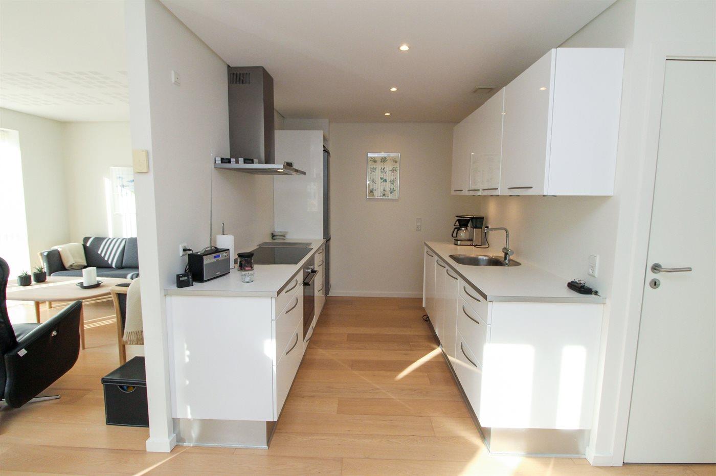 Køkkenet er udstyret med 1 køleskab. Der er 4 keramiske kogeplader, varmluftovn samt opvaskemaskine Der er gulvvarme i køkkenet.