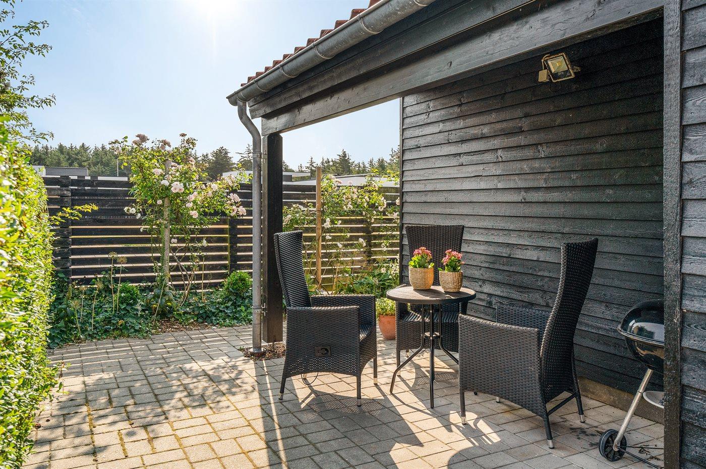 Ferieboligen er beliggende på en 1200 m² stor havegrund. Grunden er indhegnet. Der er 900 m til havet. Nærmeste forretning er beliggende i en afstand af 600 m. Til ferieboligen hører 70 m² terrasseareal. Desuden er der 10 m² overdækket terrasse. Parkering ved ferieboligen.