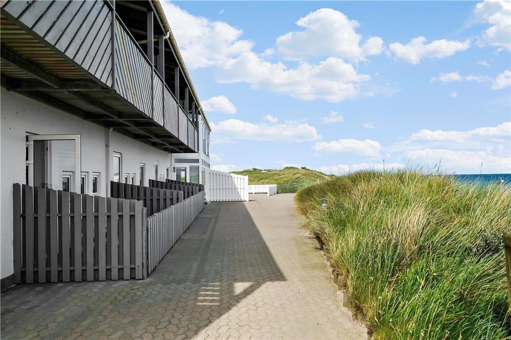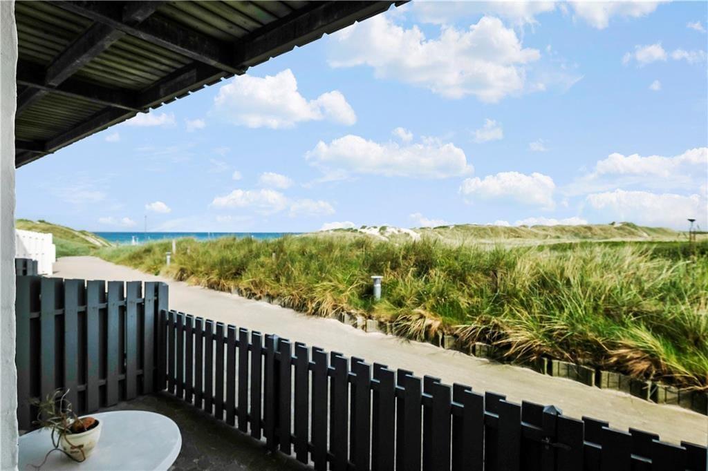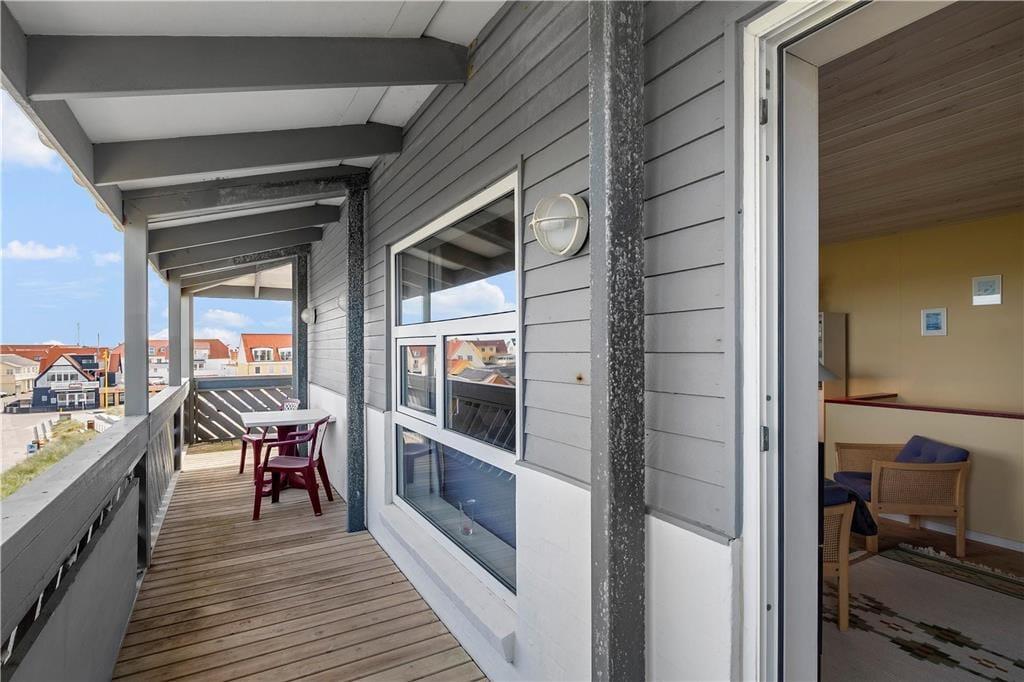 Mod nordhar man i stueetagen en skøn terrasse med udsigt til klitterne og havet, mens man fra opholdsrummet på 1.salen går ud på en stor balkon i det nordøstlige hjørne. Her er god læ for Vestenvinden og sol fra morgen til omkring middagstid, så det er oplagt at nyde morgenkaffen og rundstykkerne her. Samtidig kan man lade blikket glide hen over Vesterhavet til den ene side og hen over Løkkens tagtoppe, Vandtårnet, Signalmasten og den nye mole til den anden side.