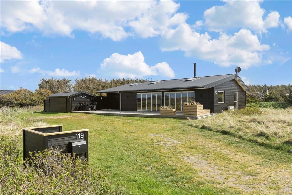 Sommerhuset er opført 2016 i de bedste materialer og indrettet i den højeste kvalitet. Arkitekturen er nytænkende og moderne med vinkler og en værelses- og badeafdeling langs sydsiden, mens det åbne køkken og opholdsrummet ligger i åben forbindelse og følger nordsiden af bygningen. Denne del af huset har loft til kip og store vinduespartier, så det skønne Vesterhavslys trænger helt ind og sammen med brændeovnen skaber en hyggelig stemning. Med tre værelser, en hems med to madrasser og to badeværelser med brusekabiner, kan man være op til seks personer i sommerhuset ad gangen, og det egner sig dermed både til en familieferie og til et ophold for to eller tre par, der gerne vil opleve denne del af Nordjylland i hinandens selskab. Sommerhuset har en del moderne udstyr, som vil gøre enhver ferie her til en leg, og en god mulighed for at få lidt kvalitetstid med dem man holder mest af: trådløst internet, parabol, varmepumpe og gode hårde hvidevarer; husk blot at medbringe pc eller tablet hjemmefra, så vil det også være nemt at søge oplysninger om områdets mange seværdigheder og attraktioner.