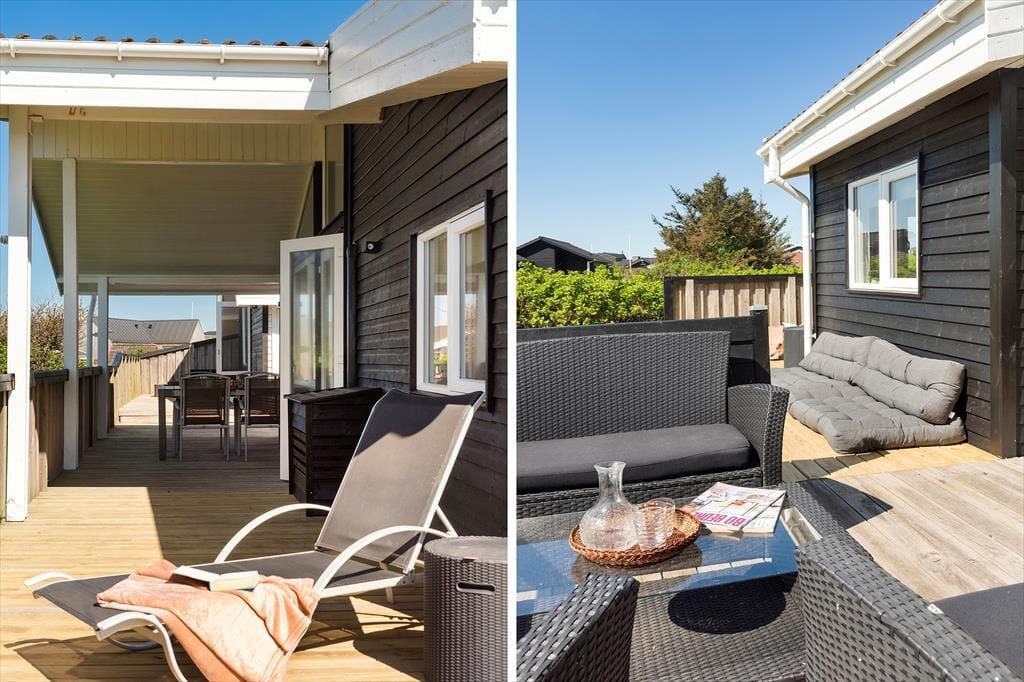 Med terrasser på nord, øst og sydsiderne af huset er der garanti for mange dejlige timer udendørs. En stor del af terrasserne er aflukkede, så her er trygt for børnene. På sydsiden er en overdækket del, her er især skønt om aftenen, når duggen falder på. Til børnene er her både sandkasse og gynge og masser af plads at boltre sig på.