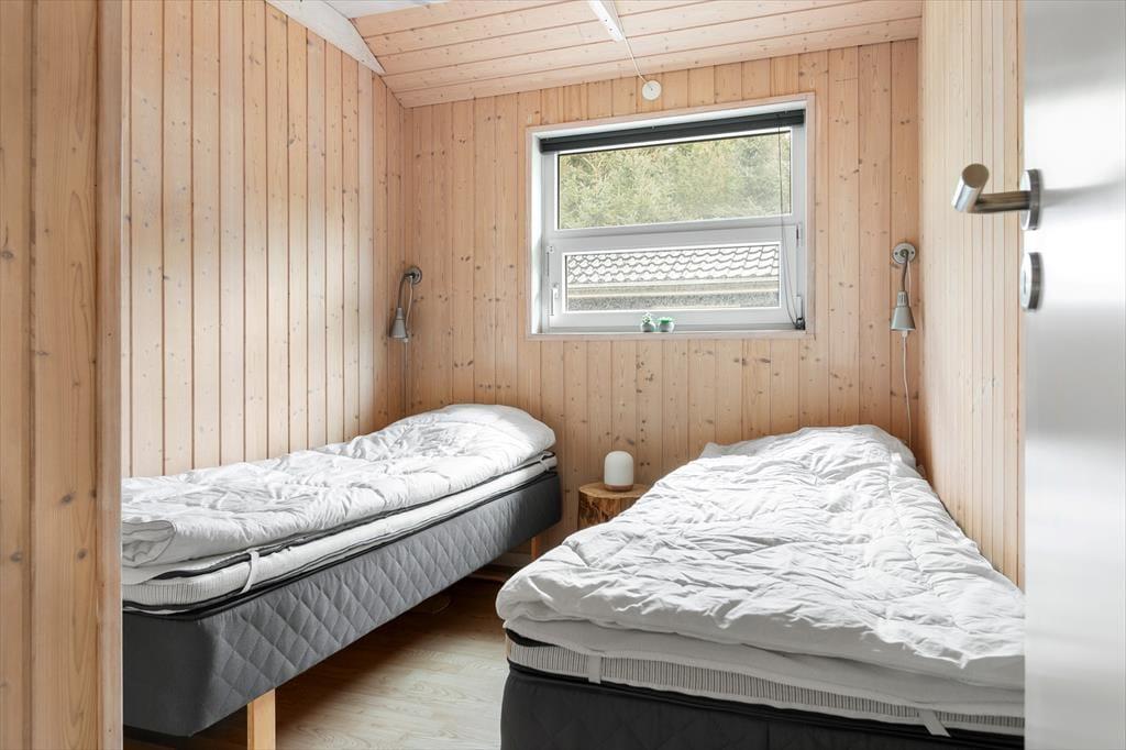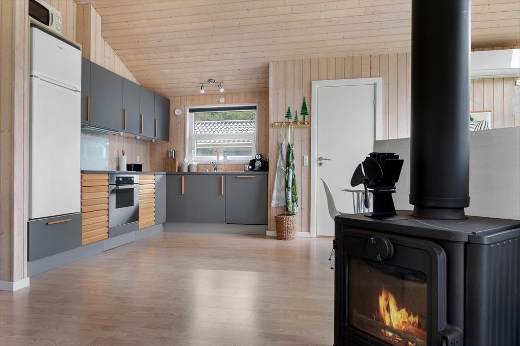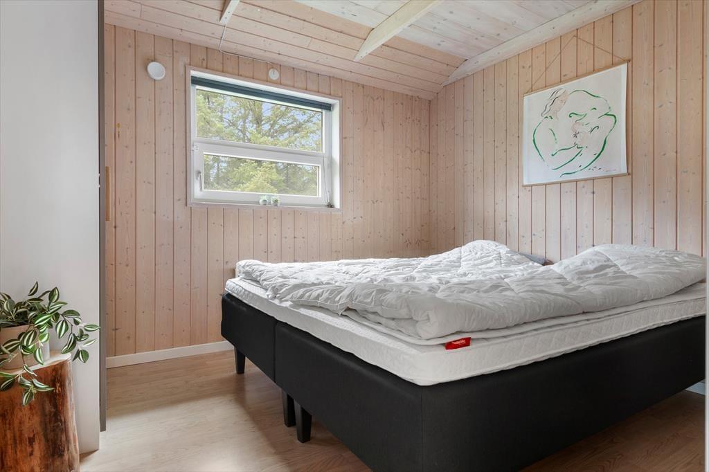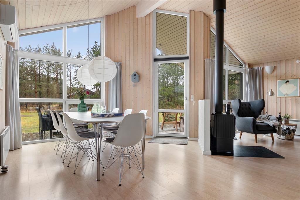 Når du træder ind i sommerhuset, vil du straks mærke den lysfyldte og indbydende atmosfære. Huset er indrettet med store vinduer, der trækker den omkringliggende natur ind i stuen, og de høje lofter giver rummene en ekstra følelse af plads og luftighed. Køkkenet er åbent og i perfekt forbindelse med opholdsstuen, hvor du kan sidde og nyde udsigten til den smukke natur omkring huset. Her er der plads til samvær, uanset om du laver mad i det veludstyrede køkken eller slapper af foran den åbne stue. Sommerhuset rummer tre gode soveværelser og et badeværelse, som gør det muligt for hele familien at opholde sig komfortabelt under ferien.