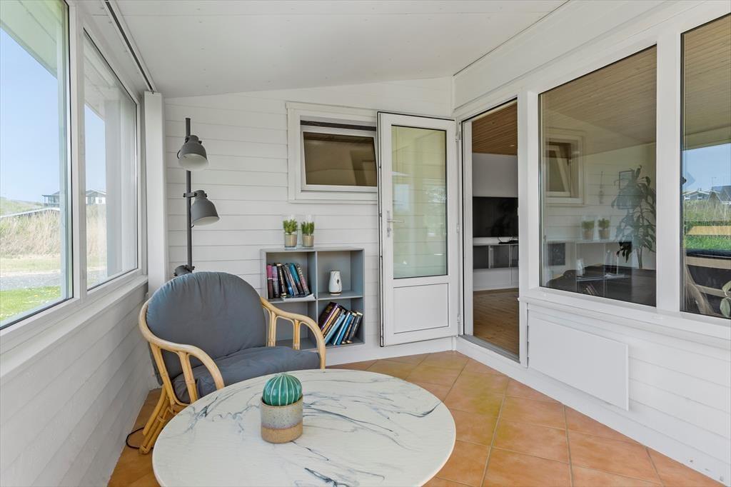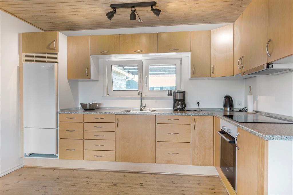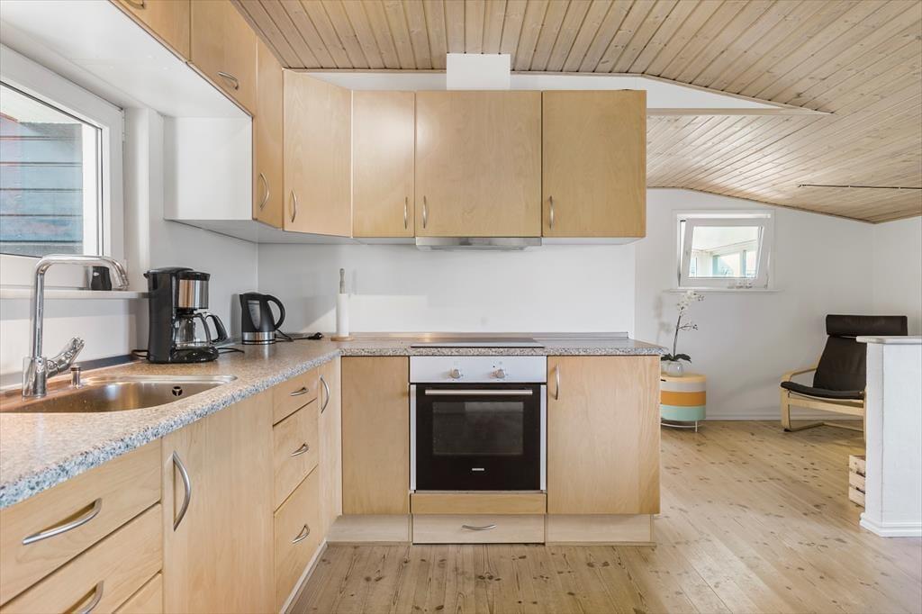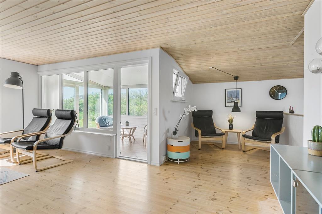 Huset er dejligt lyst, og indretningen sætter gode rammer om ferieturens hyggelige samvær med familie og venner. Køkken og stue ligger i åben forbindelse, så her kan I hygge jer over madlavningen og stadig være med i snakken ved bordet. Opholdsmiljøet får lys fra flere verdenshjørner og har både sofaafdeling og en lille læsekrog. Herudover er der en skøn udestue, hvor I kan sidde og nyde alt det grønne i haven i første parket. På lune sommerdage kan I åbne ud til terrassen, så I får solen og den friske luft med helt ind i huset. Planløsningen byder herudover på to soverum, et badeværelse og en entré med vaskefaciliteter.