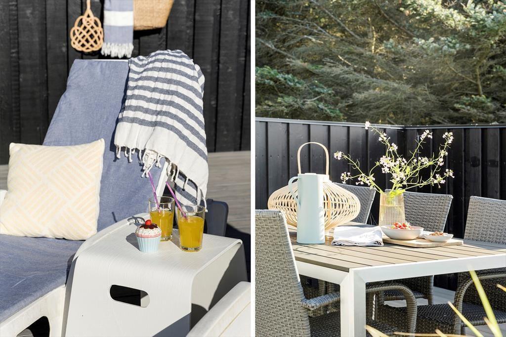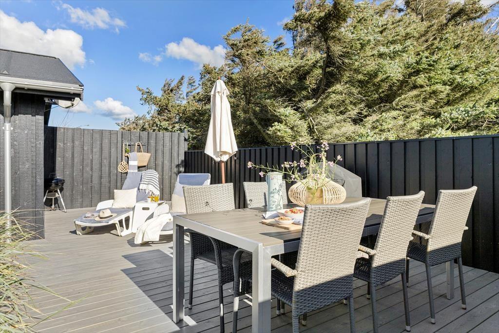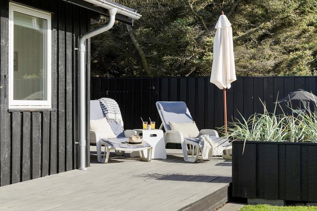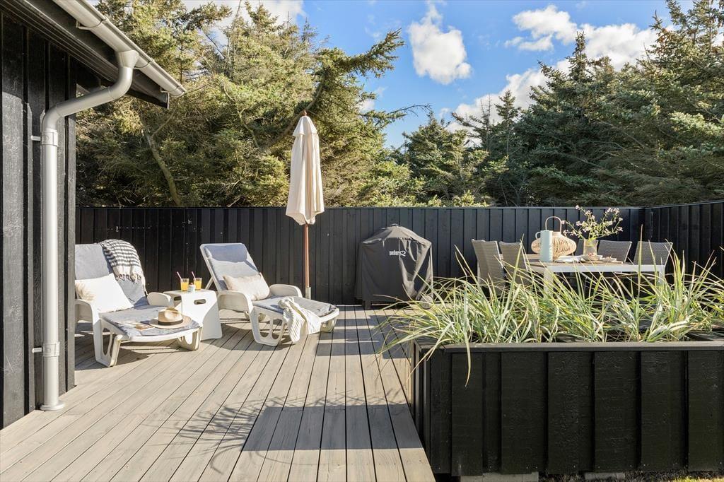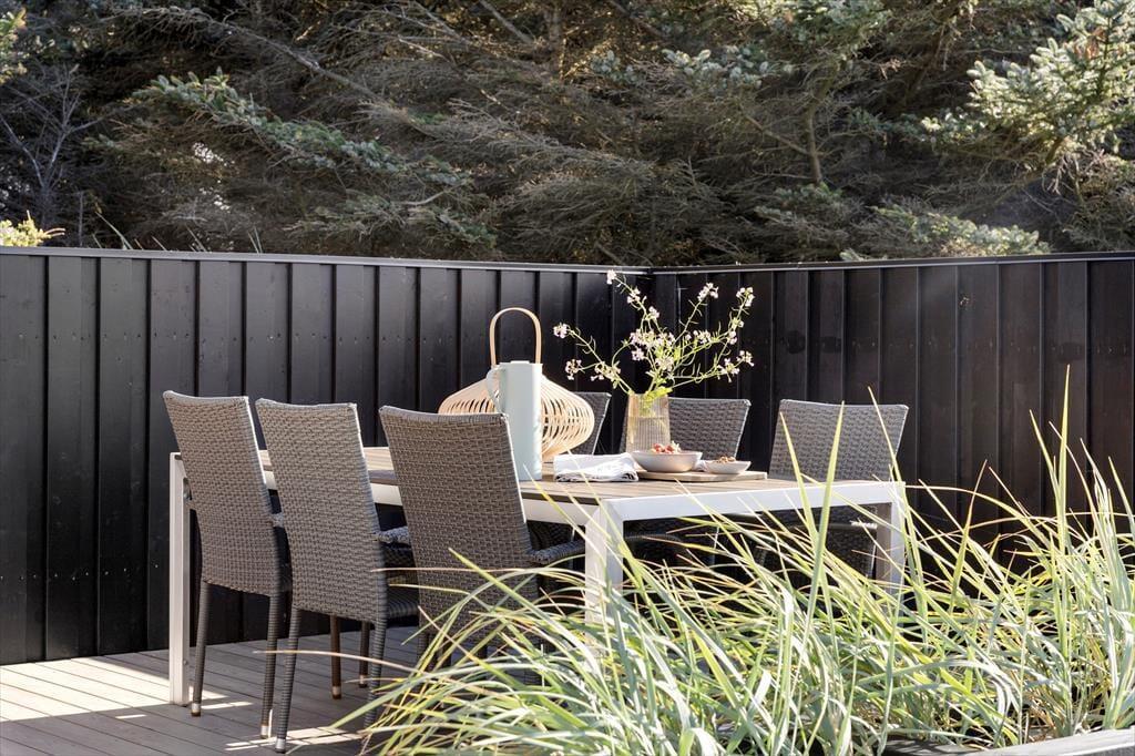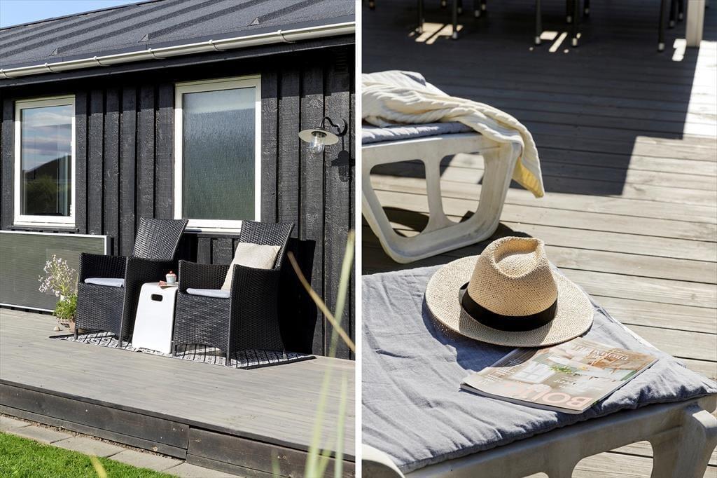 En stor træterrasse breder sig mod øst, syd og vest for sommerhuset, så uanset tidspunktet på dagen får I nemt ved at finde en god opholdsplads i solen. Grunden er med sine 2590 m2 dejligt stor, så der er god afstand til naboerne, og på græsplænen kan hele familien hygge sig med at spille bold og lege.