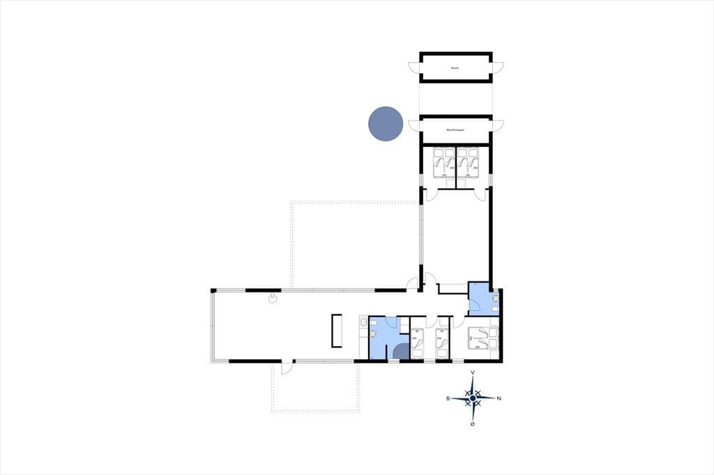 Inden døre har I hele 141 m2 at brede jer på, og med fire soveværelser og to badeværelser er planløsningen perfekt afstemt til otte personer. Trænger I til en rolig eftermiddag, er stuens sofaafdeling et skønt sted at sætte sig med sin bog eller tablet – eventuelt med ild i brændeovnen, hvis vejret er til det. Vil I spille brætspil, kan I samles omkring spisebordet, der står mellem stuens store vinduespartier og lige ved det åbne køkken. Er humøret mere til en film, kan det lade sig gøre både i stuen og i aktivitetsrummet, for begge rum er udstyret med et stort fjernsyn. På det største af husets badeværelser finder I et spabad, så wellness kan også indgå i afslapningsstunderne. Skal der være mere gang i den, er det skønt at have aktivitetsrummet, hvor I kan dyste i bordtennis og bordfodbold.
