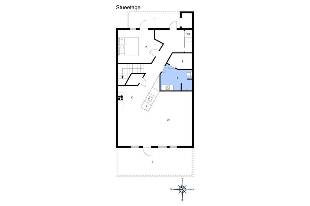 Lejligheden er opført i to plan og hører til Løkken Feriepark, Nordenlys. Stueetagen indeholder et af i alt fire soveværelser, et badeværelse med sauna, og opholdsstuen med et åbent og veludstyret køkken. Herfra er der adgang til en stor sydvendt stenterrasse. På første sal ligger yderligere tre soveværelser. Fra to af soveværelserne har man adgang til en stor og delvis overdækket balkon, mens badeværelset her byder på toilet, bruser og spabad. Fordelingen af værelser og badeværelser gør det oplagt at vælge denne lejlighed, hvis man er to familier, som ønsker at holde ferie sammen.