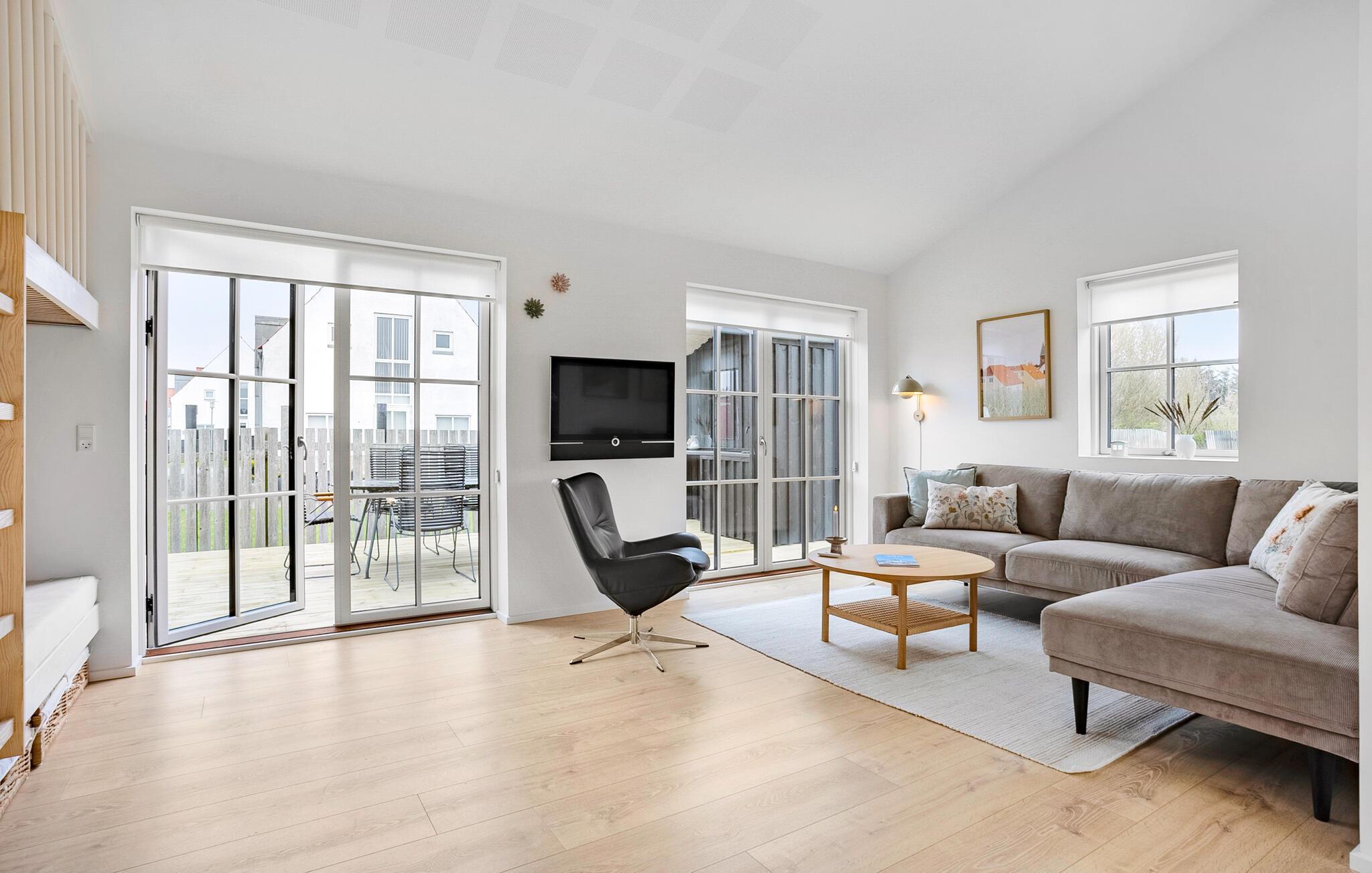 Dette moderne feriehus ligger i et roligt kvarter, kun få minutters gang fra Løkkens bymidte og den populære sandstrand. Her er der gode rammer til en børnefamilie eller to par og giver jer en skøn base i smukke omgivelser. Træd ind i den rummelige opholds- og spisestue, som får masser af lys ind gennem de store vinduespartier. Læn jer tilbage i den behagelige sofa eller planlæg feriedagen over en sen morgenmad ved spisebordet. Det åbne køkken med kogeø har lækre kvalitetsløsninger og masser af plads til at lave mad sammen. En fin detalje er den integrerede hems i stuen, som er et hyggeligt tilflugtssted for børn og voksne.