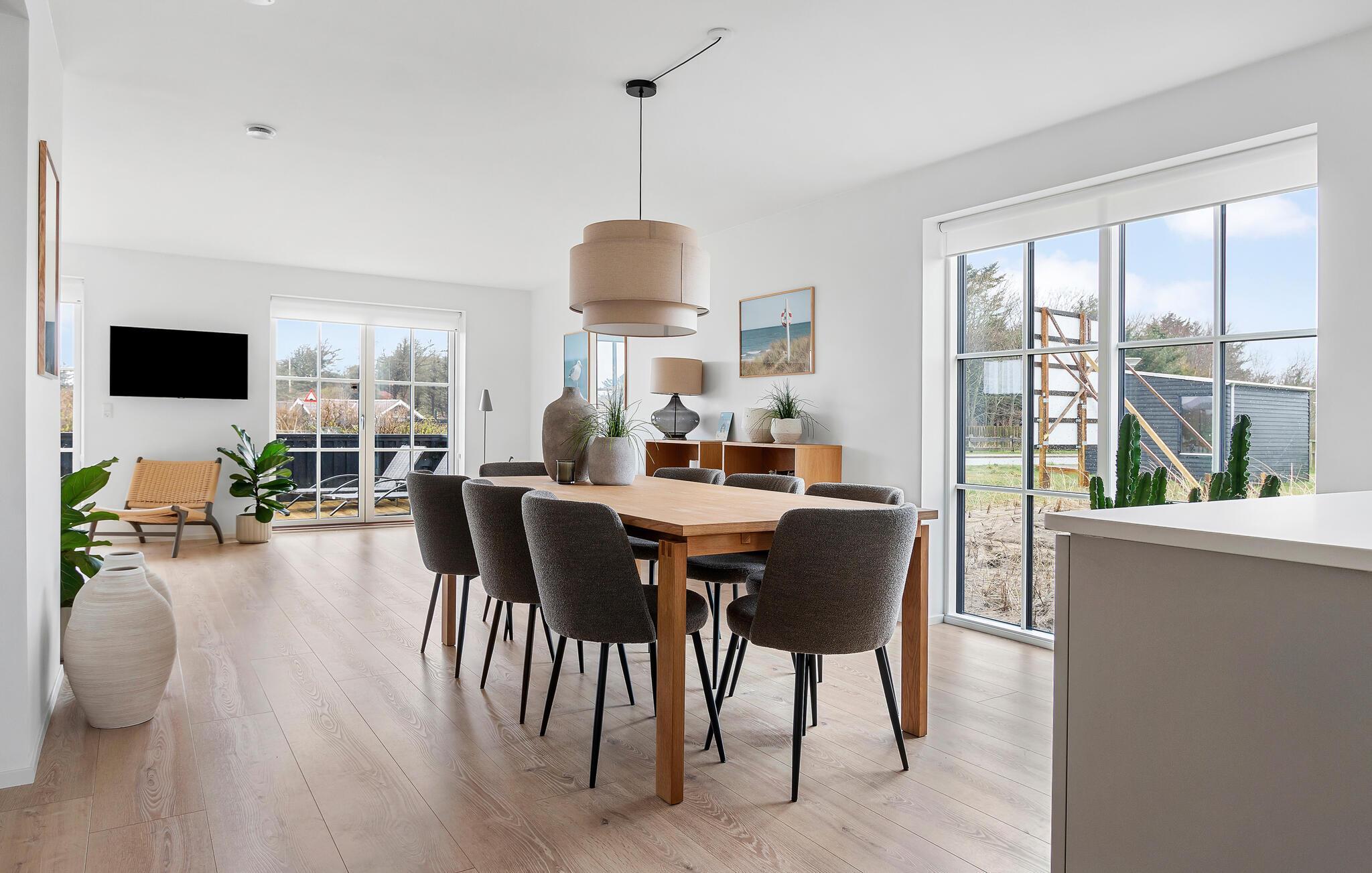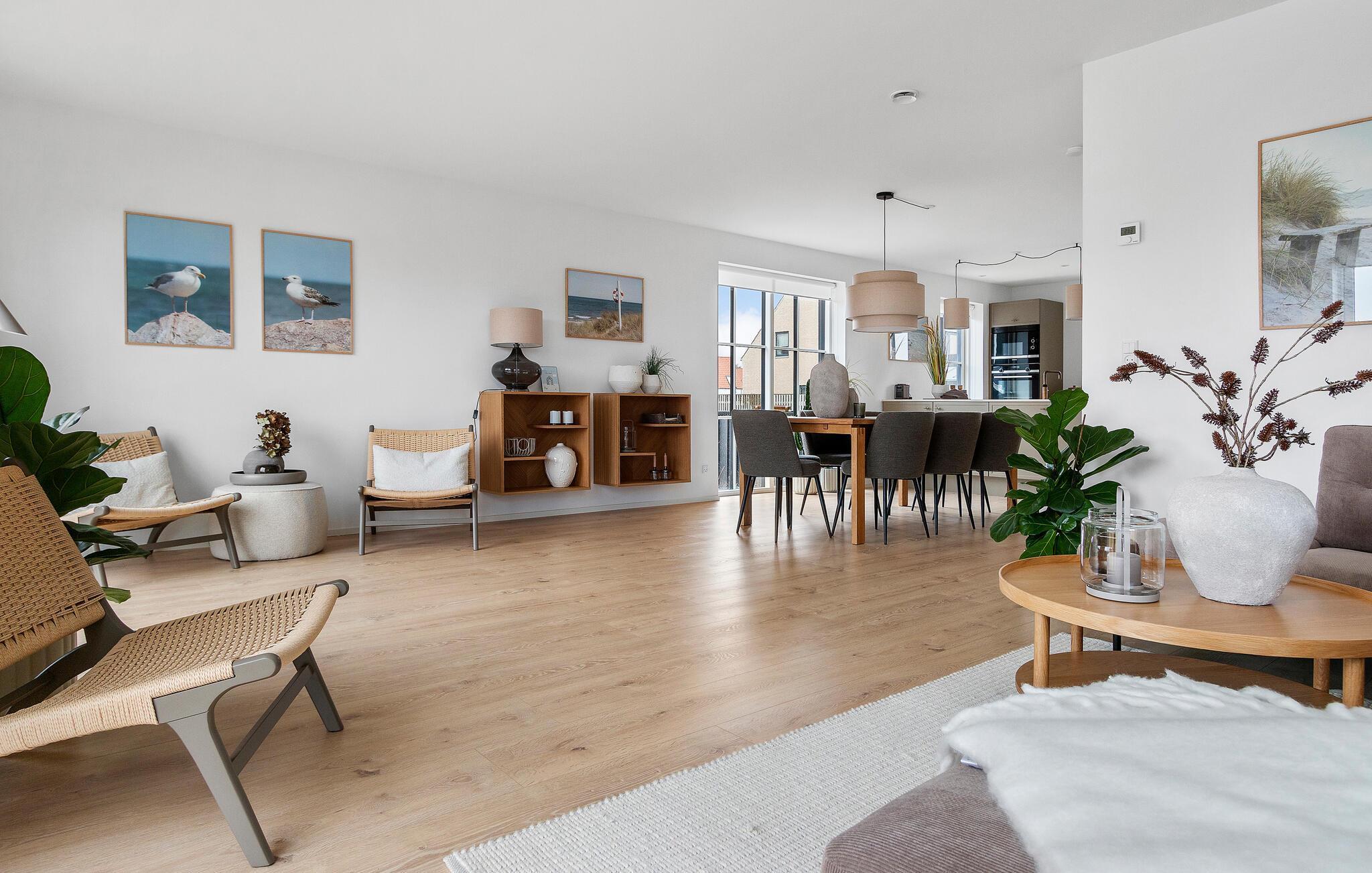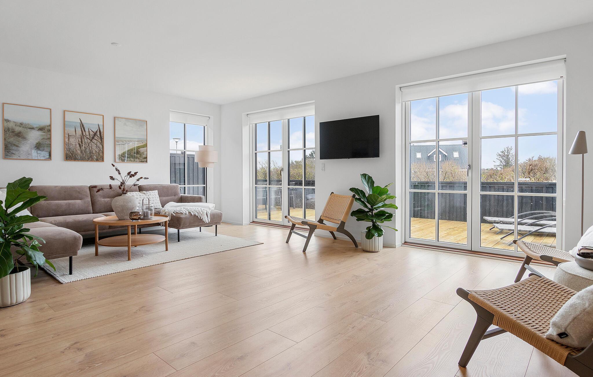 Stort, energivenligt træhus tæt på Løkken Strand med moderne faciliteter og dejlige terrasser til afslapning.