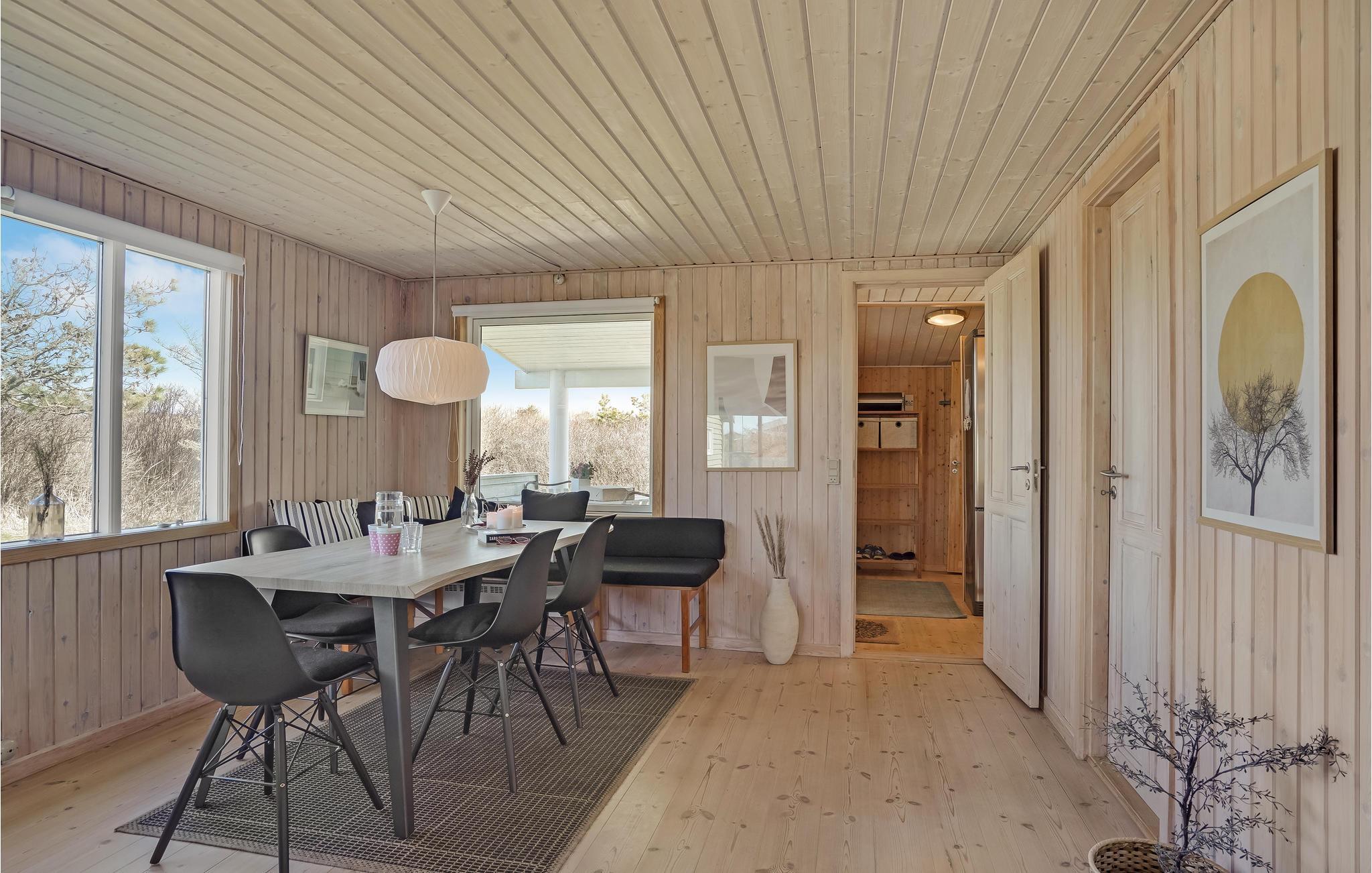Huset ligger på en åben grund, som er omkranset af træer. Boligen præsenterer sig lyst og indbydende med klassisk sommerhuscharme og behagelige lysindfald. Sæt jer med dagens måltider og nyd udsigten til omgivelserne. Efter en lang dag på farten, hvor I suget solen til jer på stranden og været aktive, er det skønt at vende hjem til denne lille oase.