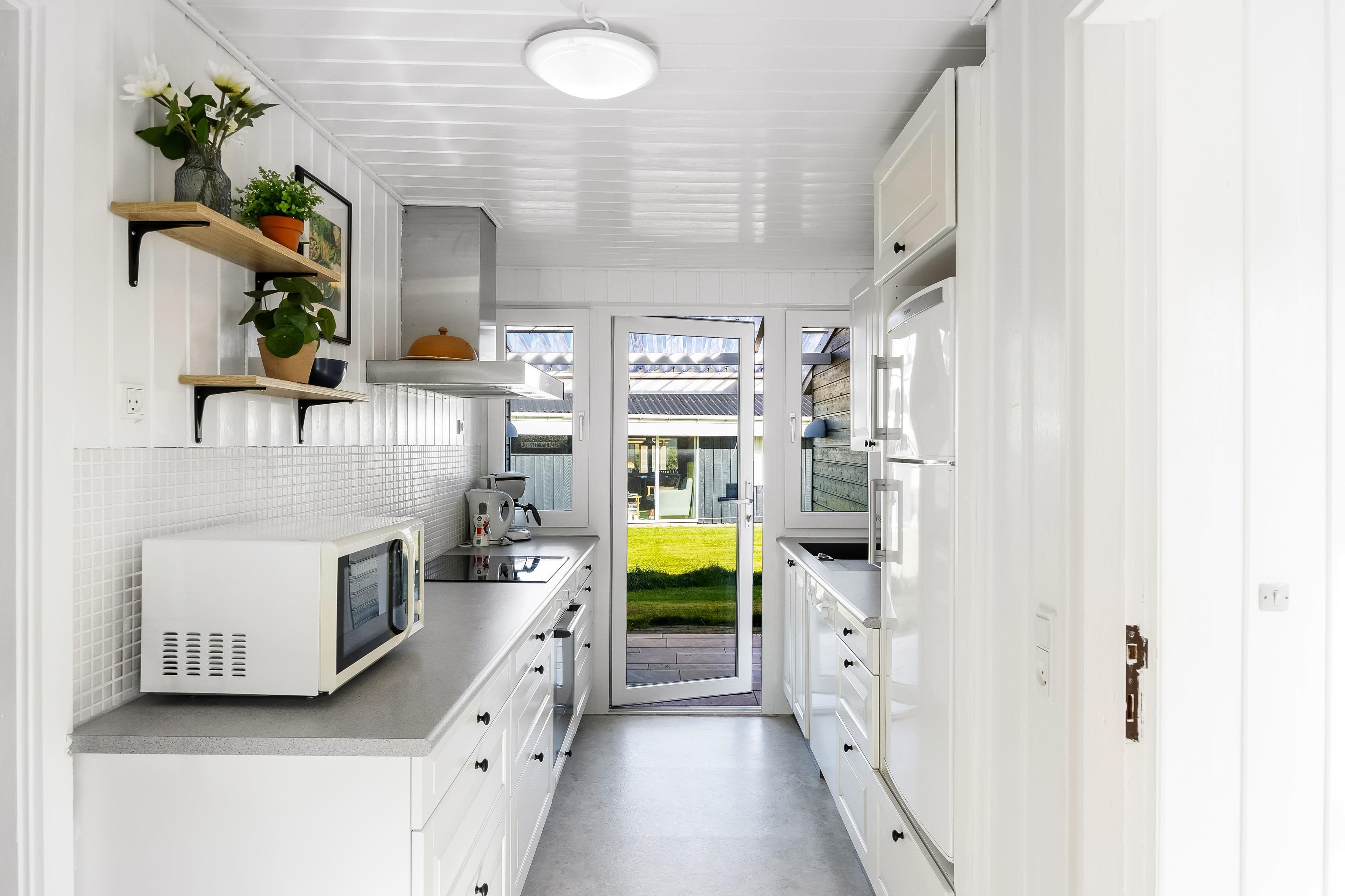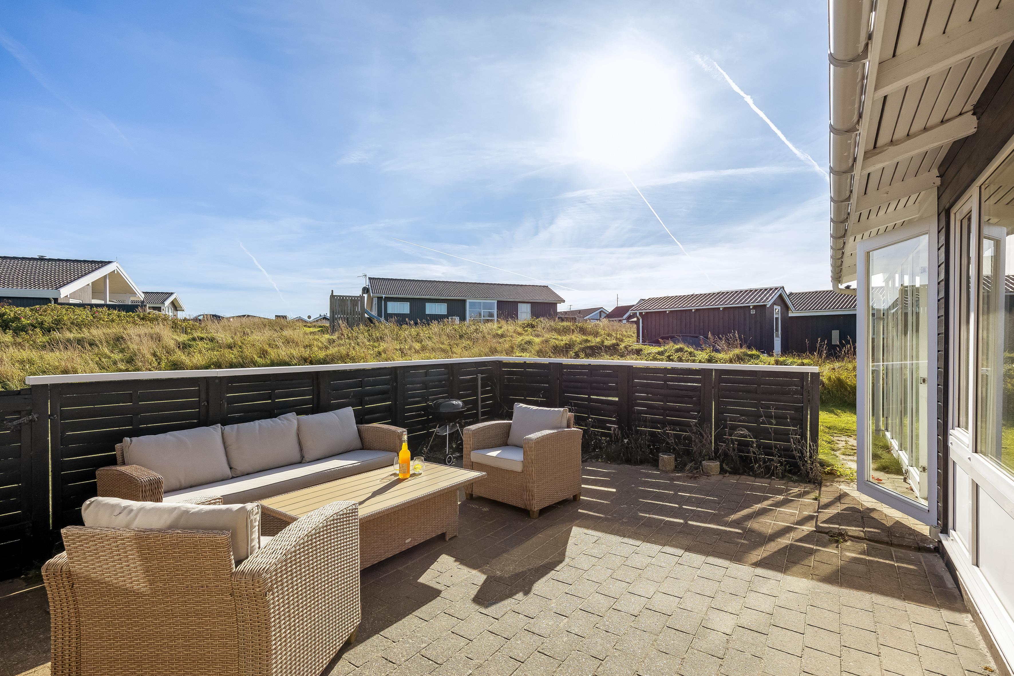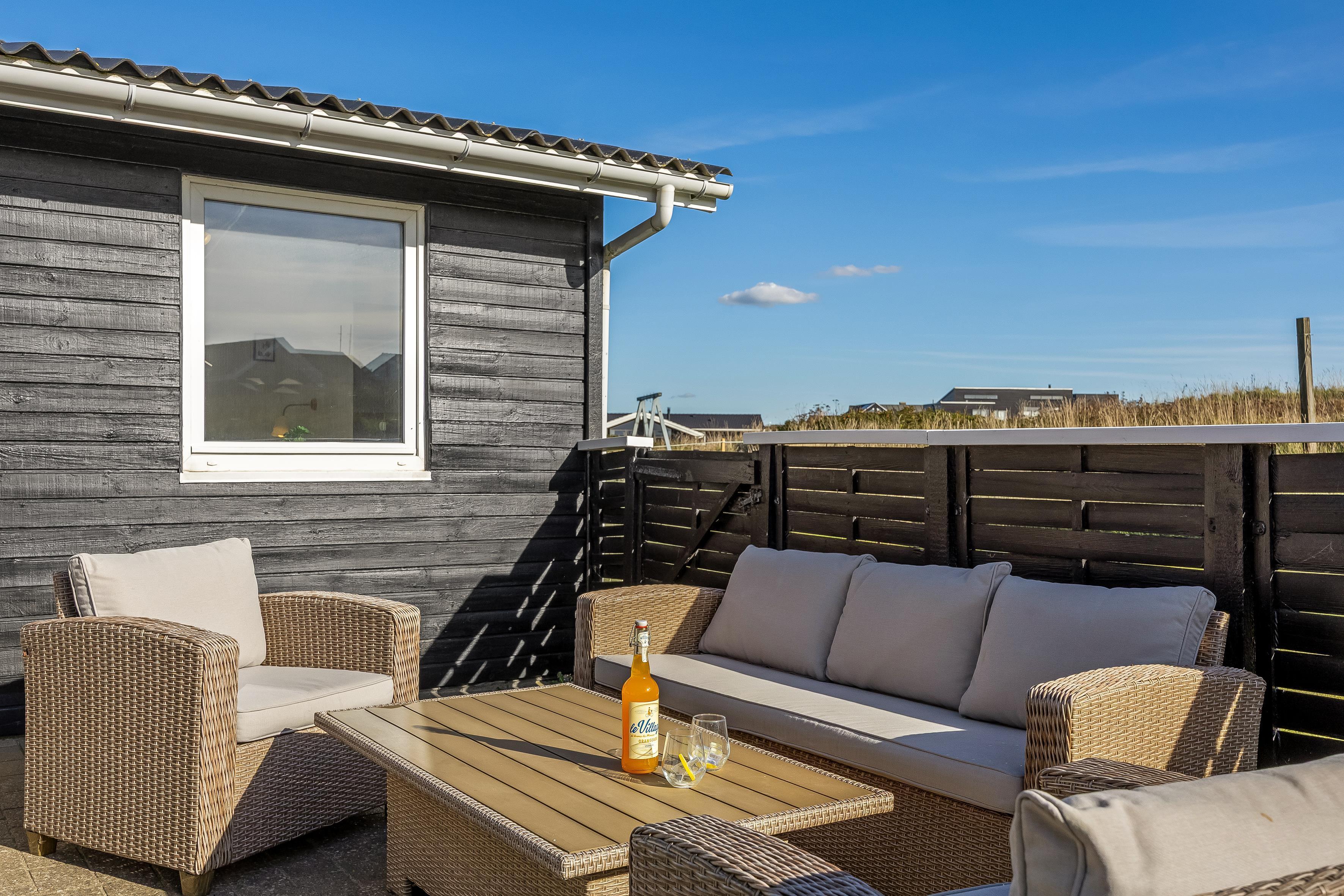 Udenfor finder du en dejlig afskærmet terrasse, som inviterer til ro, sol og nærvær. Her kan du nyde dagens måltider i det fri, læse en bog i liggestolen eller bare nyde stilheden, mens du lytter til naturen omkring dig. Den omkringliggende grund giver dig god plads og en følelse af privatliv – alt sammen tæt på kysten og med kort afstand til både Løkken og Nr. Lyngby.