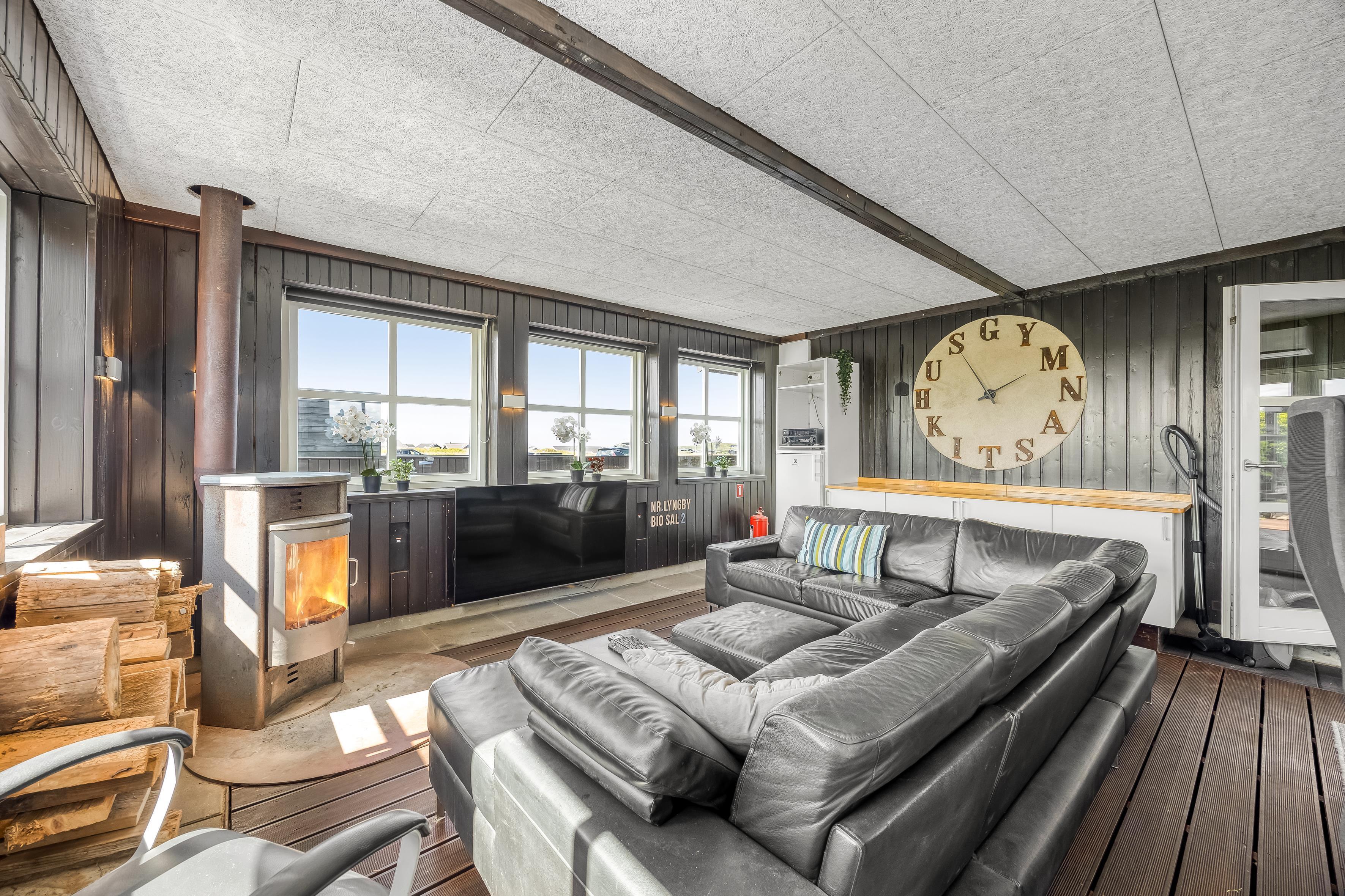 Desuden finder du den hyggelige udestue med brændeovn, som indbyder til brætspil, læsning eller en god samtale, mens flammerne knitrer. Her er masser af lys og direkte adgang til terrassen.