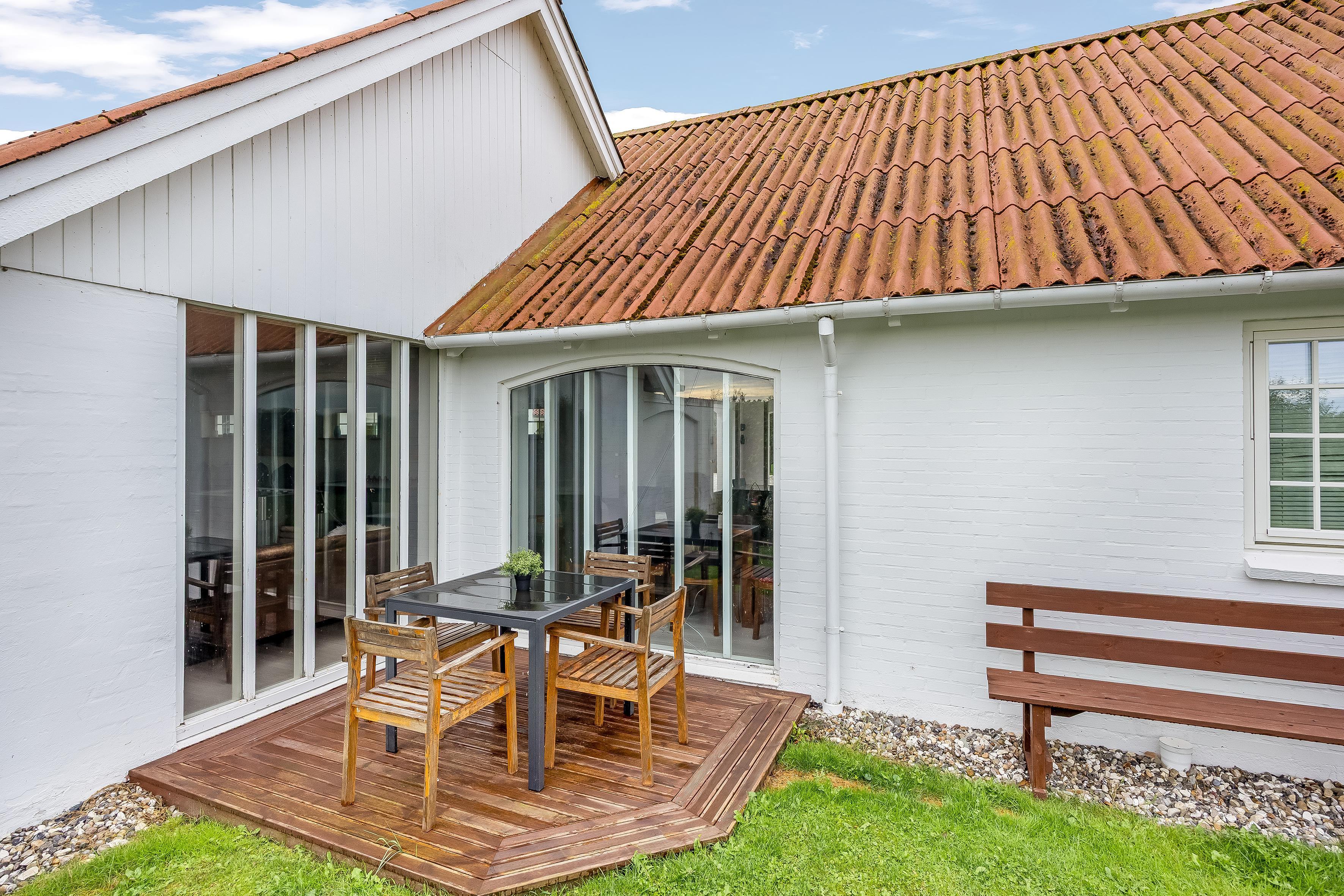 Selve ferieboligen består af hovedhusets tilknyttede længe med fælles indgang og terrassedør. Værelset er indrettet med ny luksusseng fra Høie á 180 cm, og der er væghængt TV og terrassedør mod gårdspladsen. Fællesarealerne alene udgør 120 m², så hele boligen er godt 130 m². Kommer I som større selskab, kan flere værelser lejes samtidig – med plads til op til 10 personer.