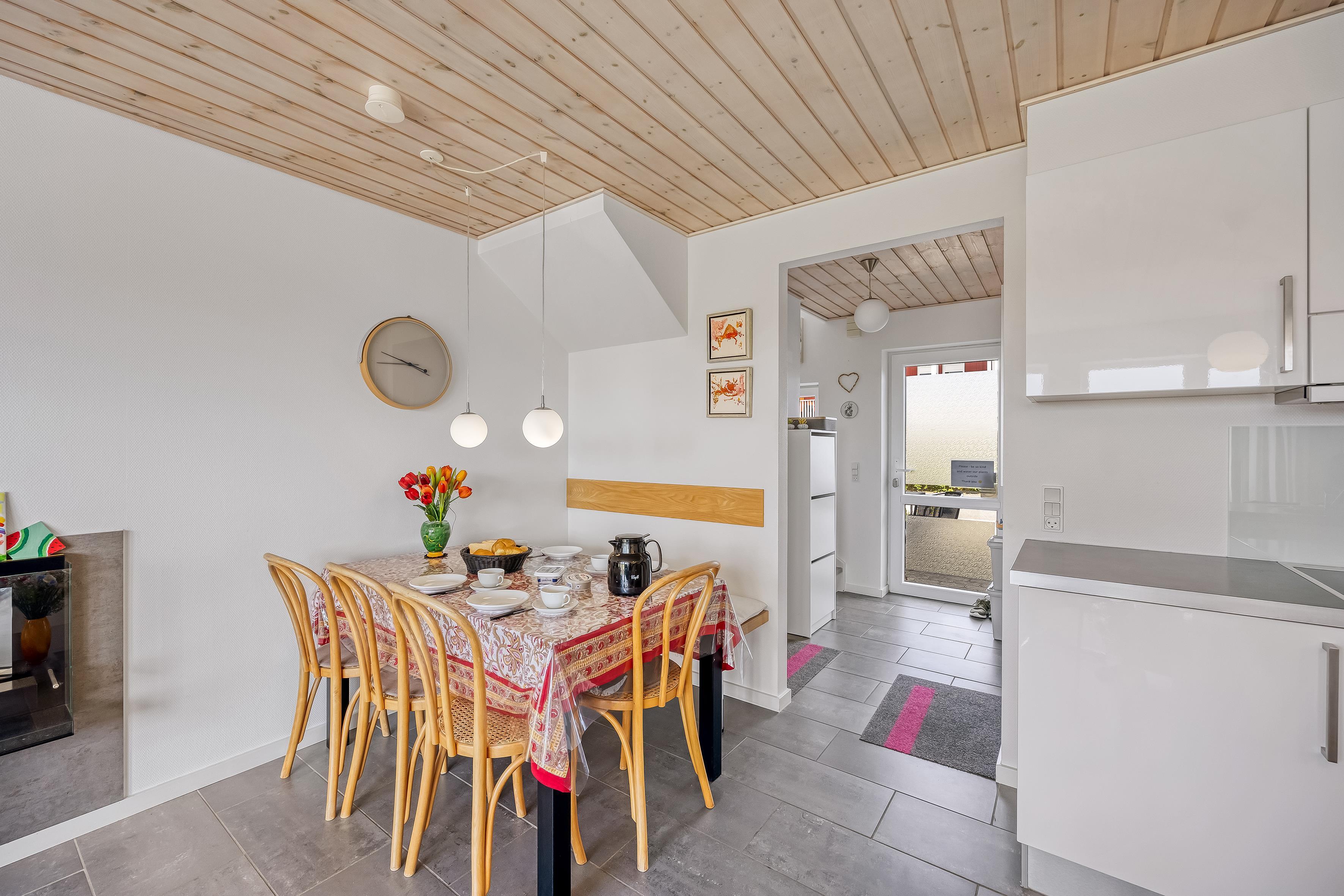 I ferieboligen er der gulvvarme i hele stueetagen, hvor en biopejs giver hygge i både stue og køkken. Køkkenet er udstyret med 1 køleskab med fryser på 30 l. Der er komfur med