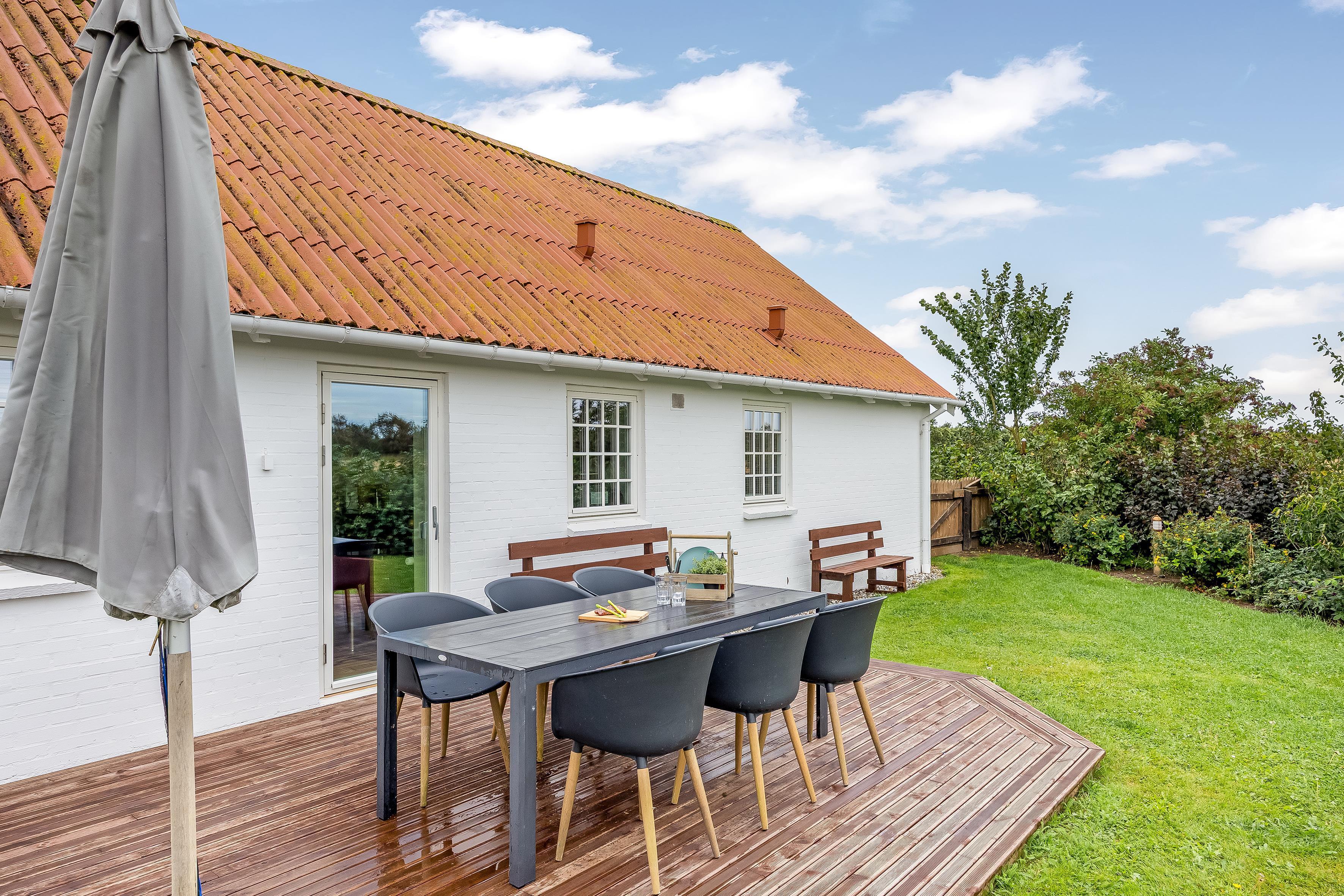 Udendørs indbyder haven til hygge. Den er indrammet af et trærækværk og oplyst af velplacerede lamper, som skaber en hyggelig stemning om aftenen.