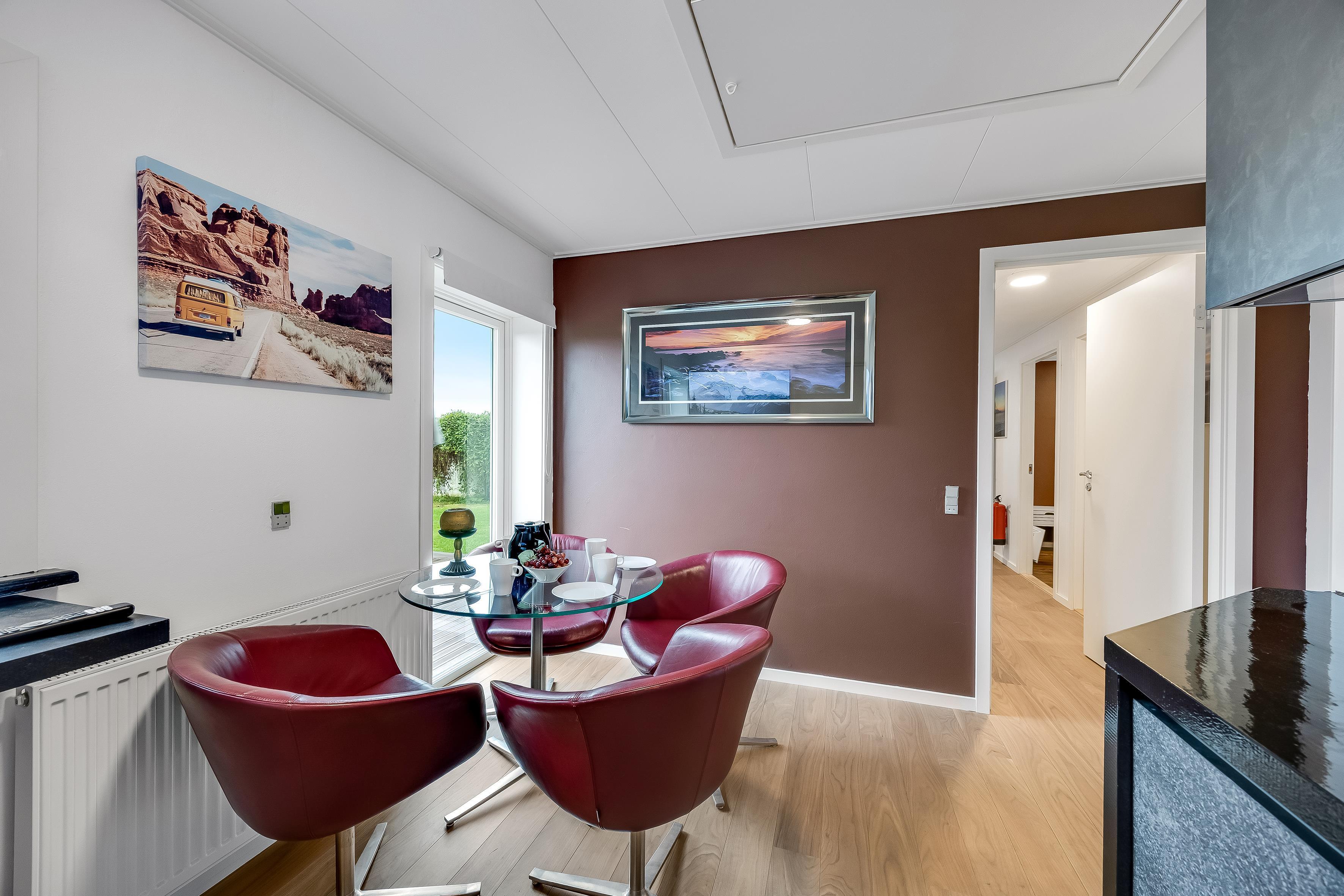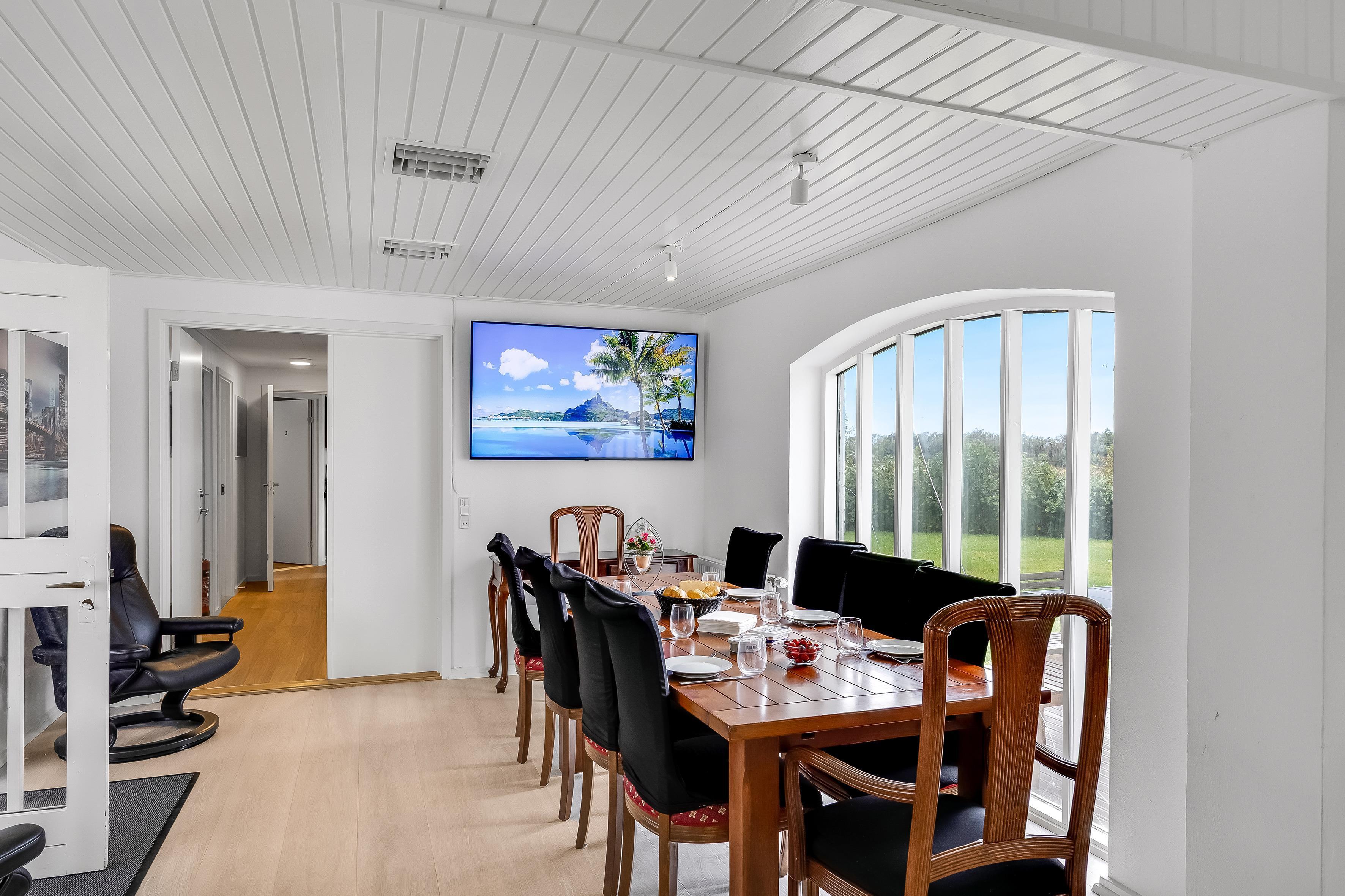 Selve ferieboligen består af hovedhusets tilknyttede længe med fælles indgang og terrassedør. Værelset er indrettet med ny luksusseng fra Høie á 180 cm, og der er væghængt TV. Fællesarealerne alene udgør 120 m², så hele boligen er godt 130 m². Kommer I som større selskab, kan flere værelser lejes samtidig – med plads til op til 10 personer.
