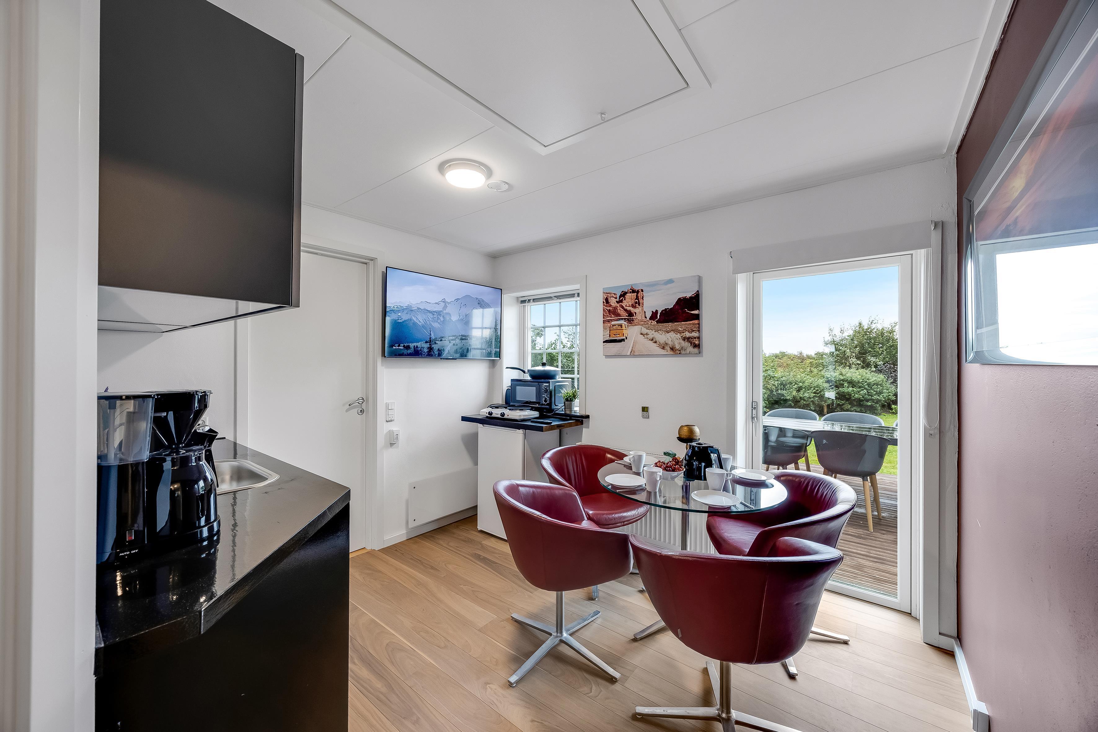 Det lille tekøkken rummer bord og fire stole samt kogeplader, mikroovn, to køleskabe, elkoger, kaffemaskine og TV. Der er desuden stor spiseplads i fællesrummet, hvor alle kan samles.