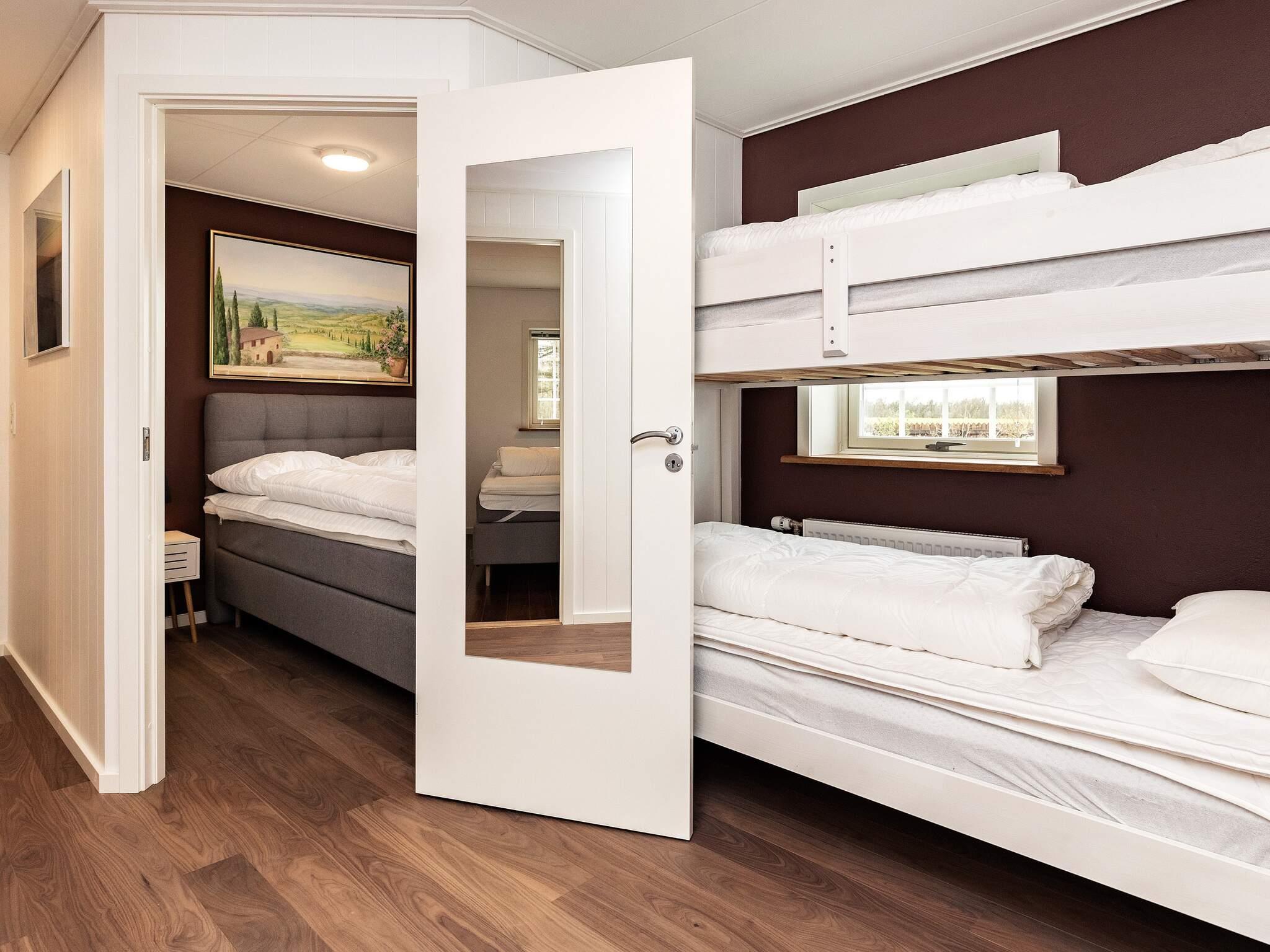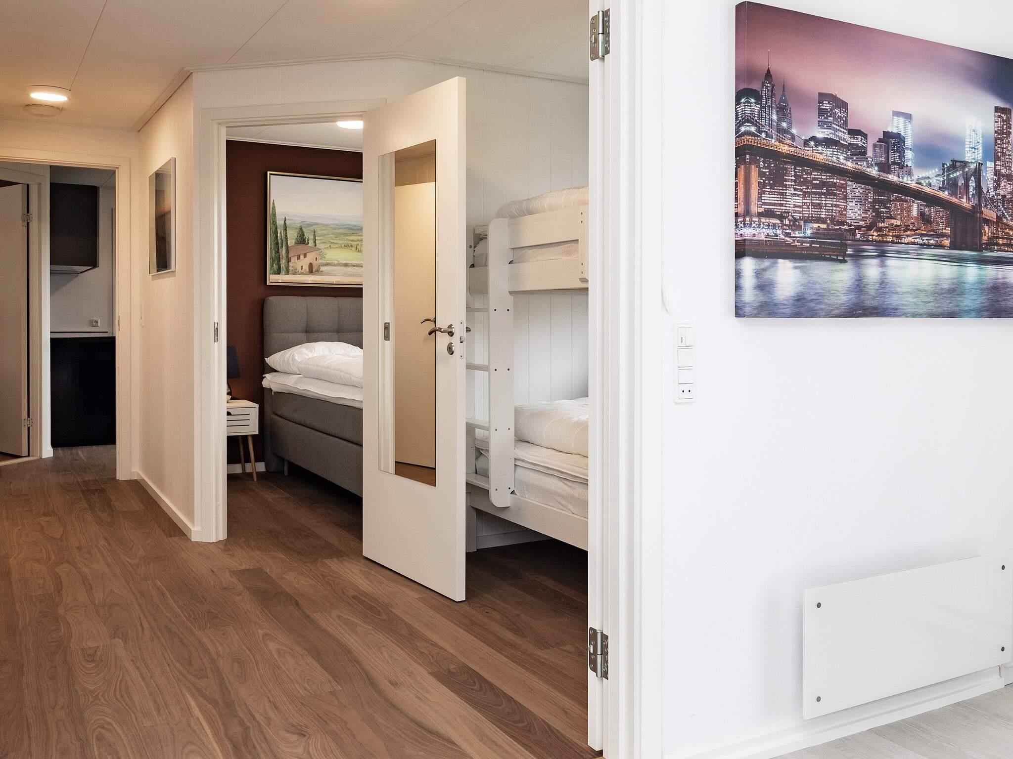 En del af første sal er soveværelset. Der er to gode soveværelser, det ene med væghængt tv og eget badeværelse. Derudover har begge altaner. Begge har gode dobbeltsenge fra Høje.
