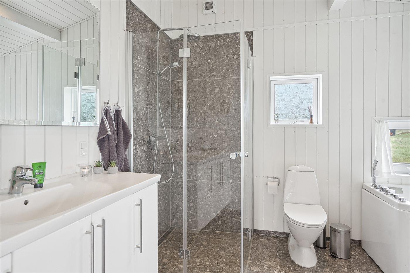 Der er 1 badeværelse med gulvvarme, toilet og et kar med boblefunktion (ikke en spa med varmelegeme). Stort badeværelsesarrangement med god opbevaringsplads.