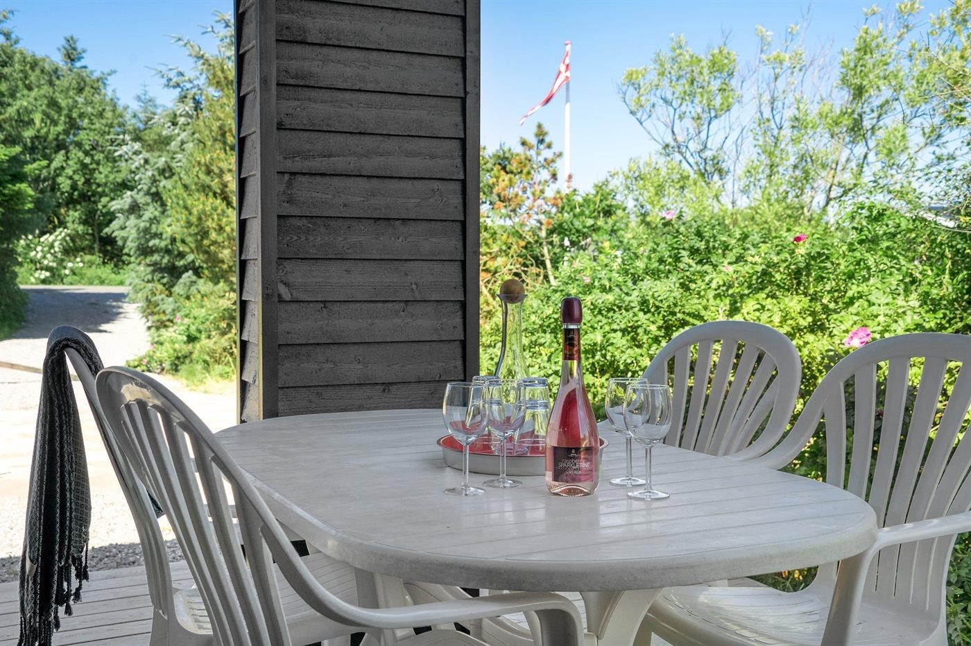 Ferieboligen er beliggende på en 1150 m² stor naturgrund. Der er 561 m til havet. Nærmeste forretning er beliggende i en afstand af 500 m. Til ferieboligen hører 17 m² terrasseareal. Desuden er der 10 m² overdækket terrasse. Der er redskabsrum. Der er carport til rådighed. Parkering ved ferieboligen.