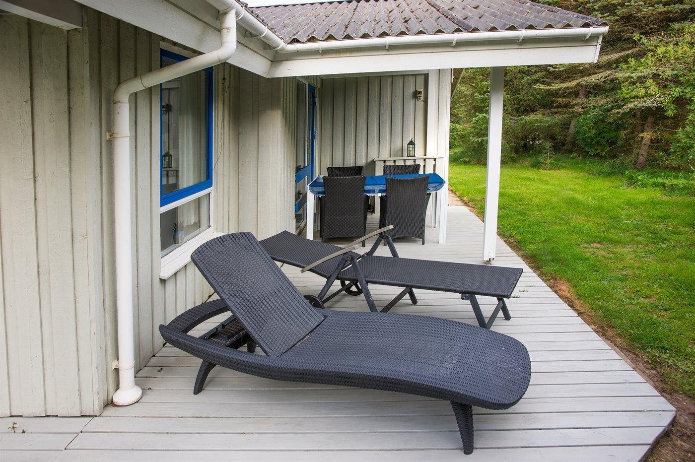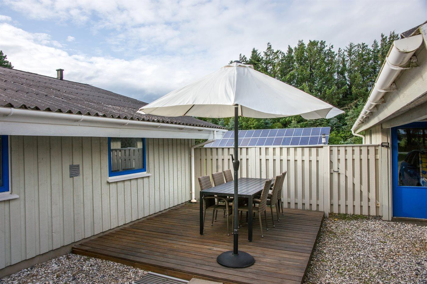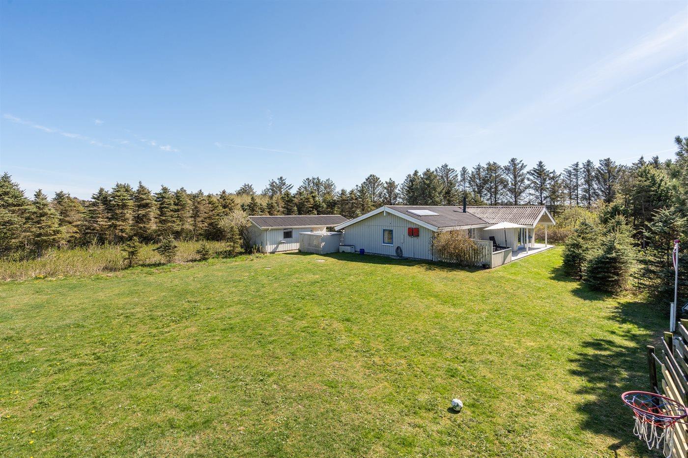 Ferieboligen er beliggende på en 2900 m² stor naturgrund. Der er 900 m til havet. Nærmeste forretning er beliggende i en afstand af 700 m. Til ferieboligen hører 75 m² terrasseareal. Desuden er der 25 m² overdækket terrasse. Der er redskabsrum. Gynge. Trampolin. Legetårn. Rutchebane. Fodboldmål. Grill til rådighed. Der er installeret stik til opladning af elbil. Parkering ved ferieboligen.