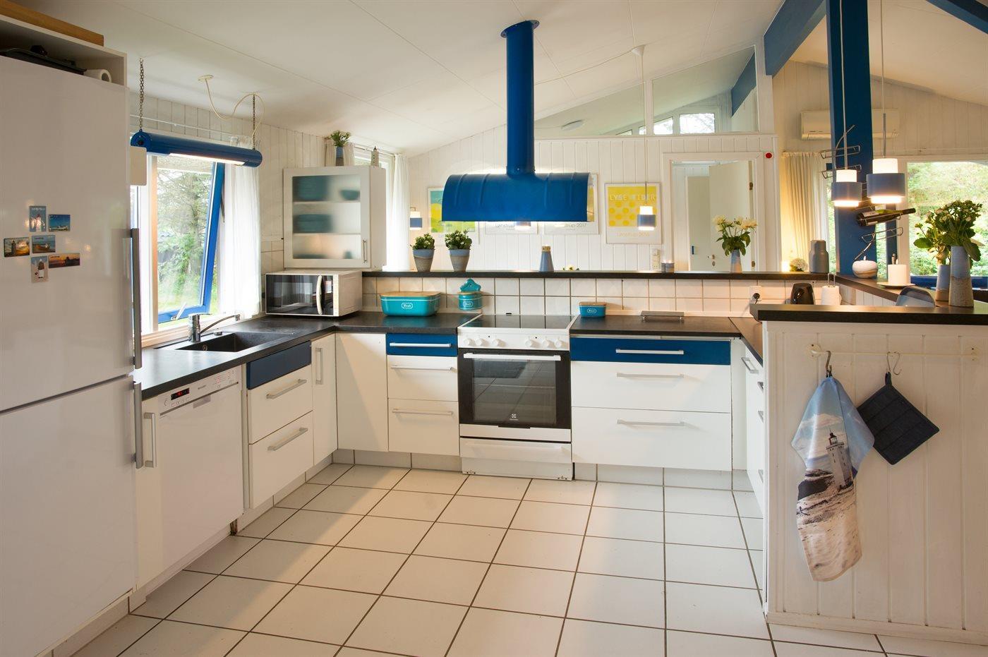 Køkkenet er udstyret med 1 køleskab. Der er 4 keramiske kogeplader, varmluftovn, mikrobølgeovn samt opvaskemaskine.