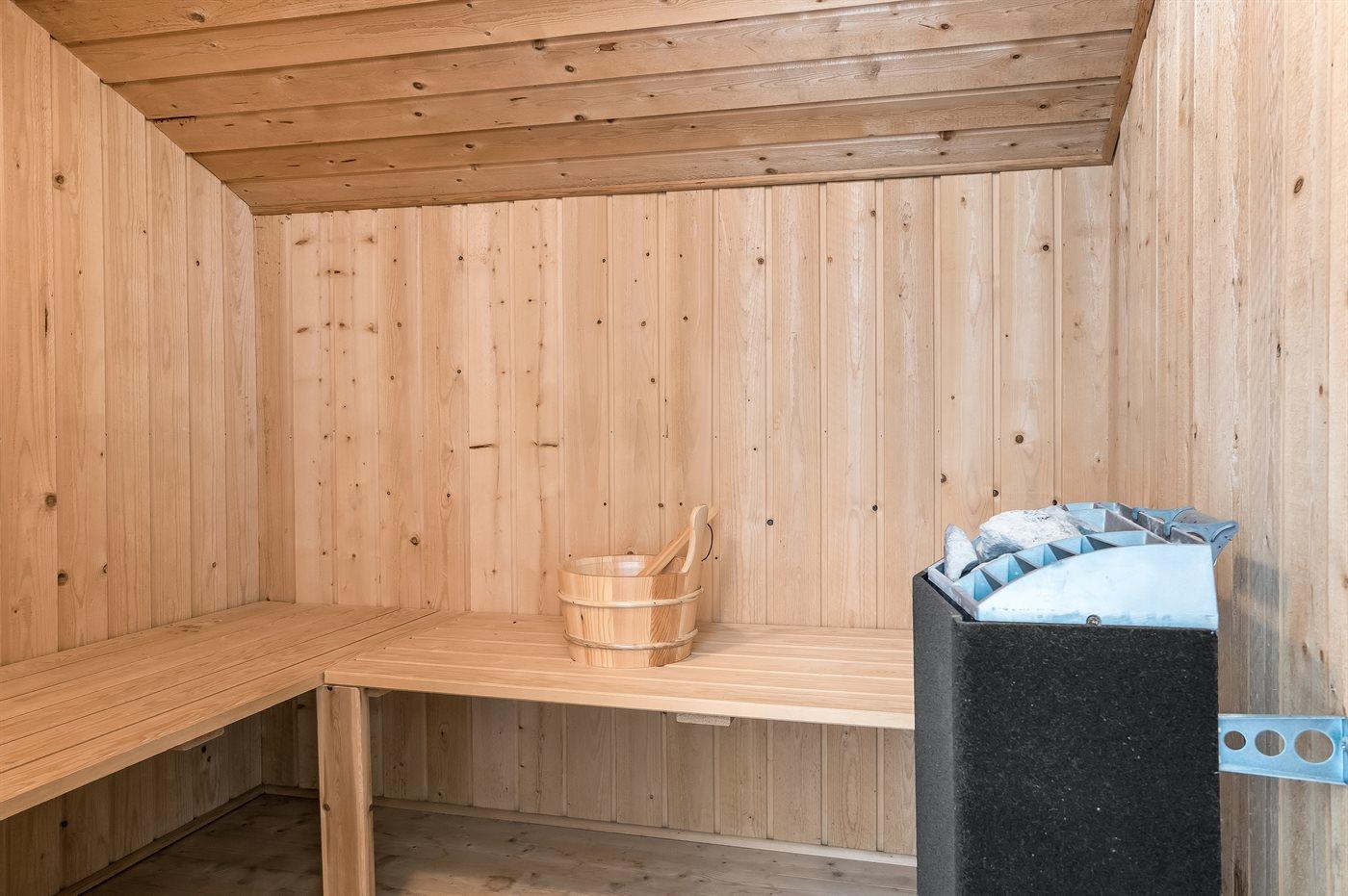 Der er 1 badeværelse med bruseniche og 2 toiletter, heraf 1 gæstetoilet. Der er gulvvarme på 1 badeværelse.. Badekar. I saunaen er der mulighed for afslapning.