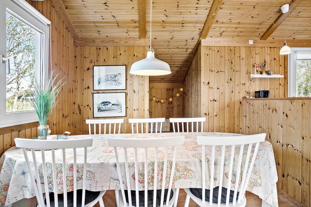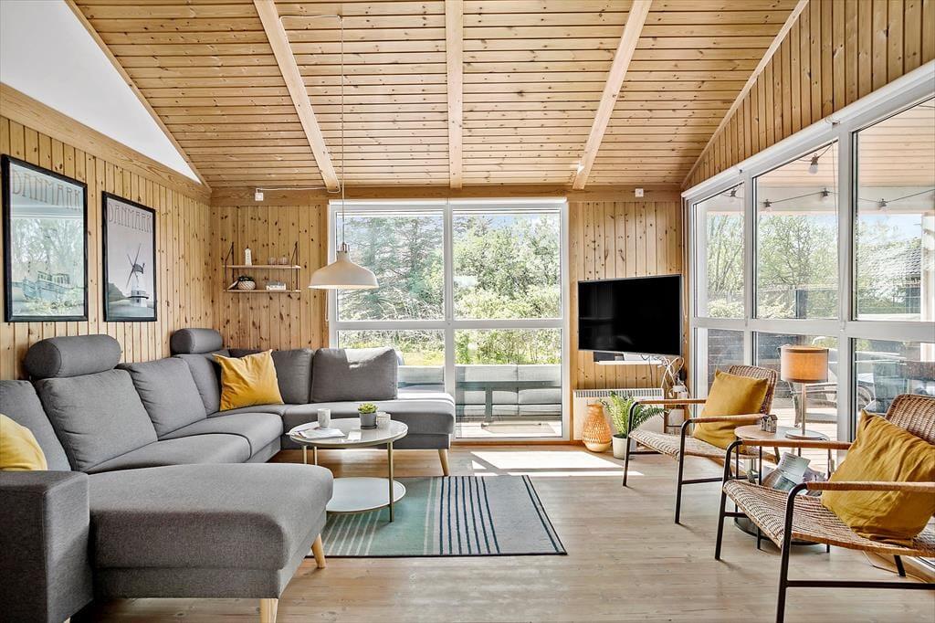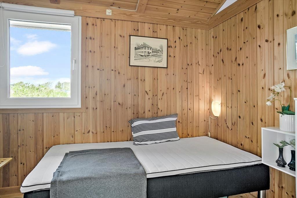 Sommerhuset er indrettet med køkken i åben forbindelse med stuen. Der er tre soveværelser, et med dobbeltseng, et med to enkeltsenge og ydeligere et værelse med en enkeltseng. Derudover findes en alkove i stuen samt en hems med to madrasser. Sommerhuset har udover det store badeværelse med spabad og sauna også et gæstetoilet. Sommerhuset er velholdt og moderne indrettet.