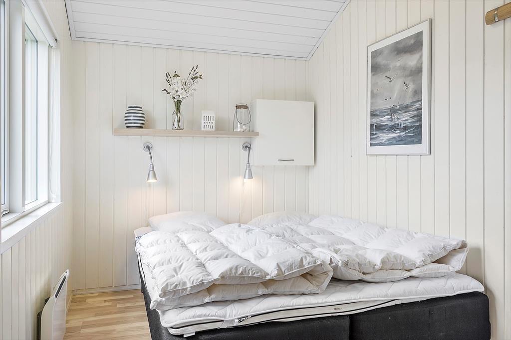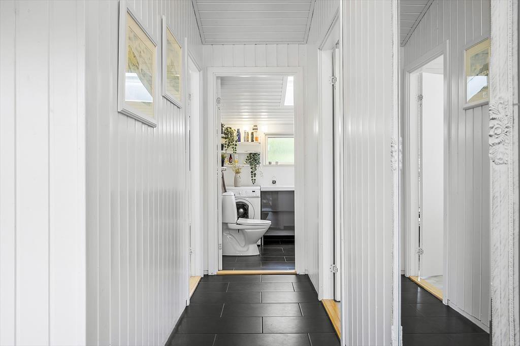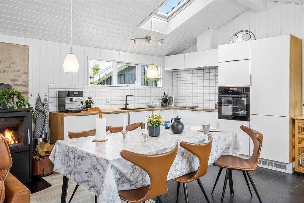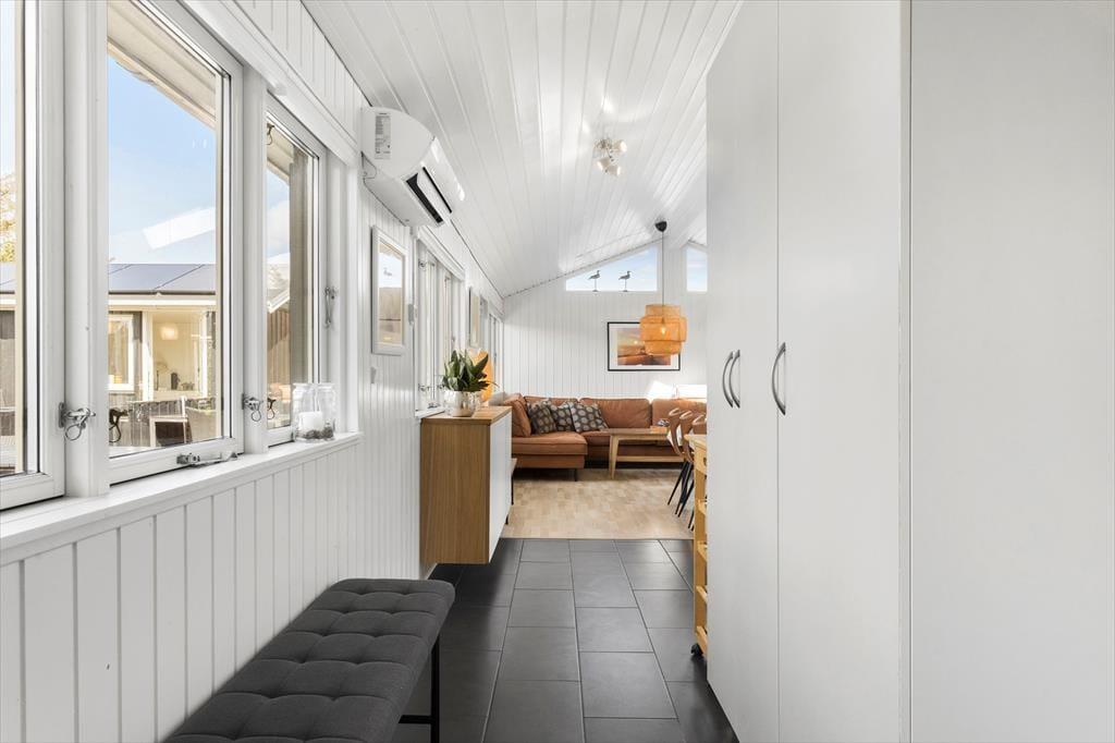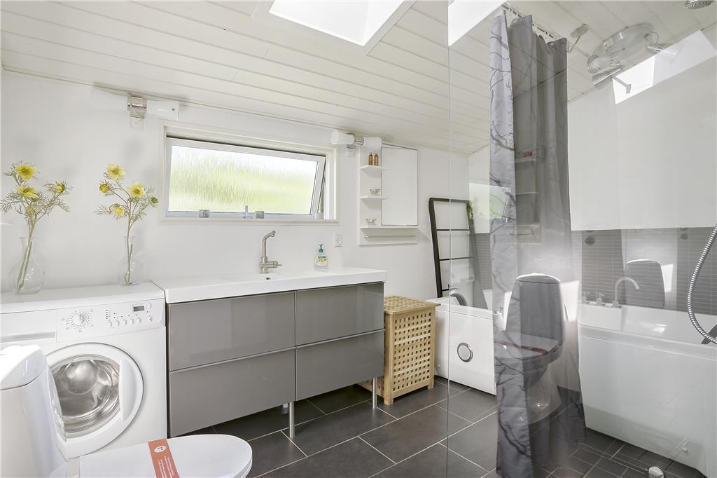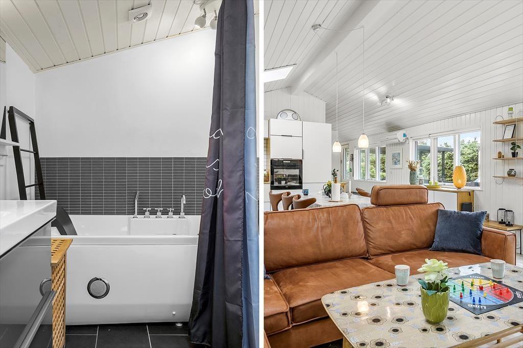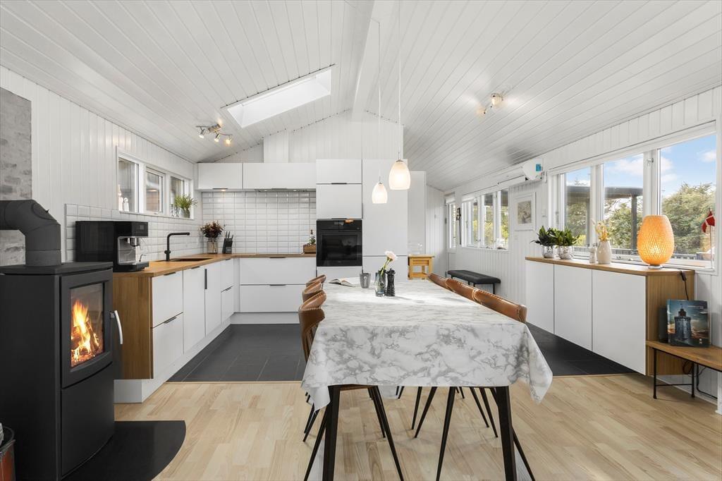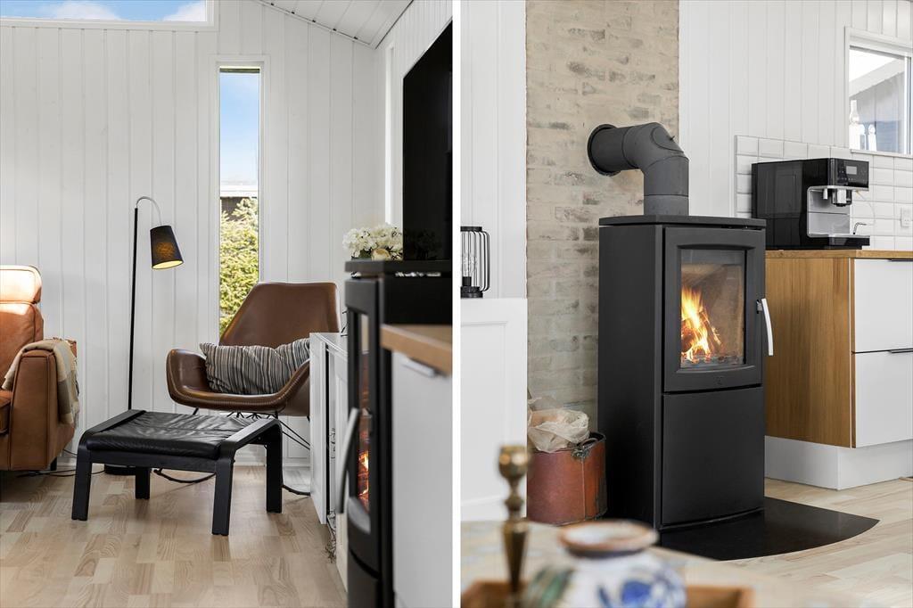 Sommerhuset er lyst og moderne indrettet med mange lækre detaljer og en sikker og gennemført stil. Især skal nævnes de pragtfulde lysindfald fra ovenlysvinduerne og det flotte badeværelse med spabad, vaskemaskine og tørretumbler. Sommerhuset er meget børnevenligt, bl.a. med gitter foran brændeovnen og stol og seng til de mindste.
