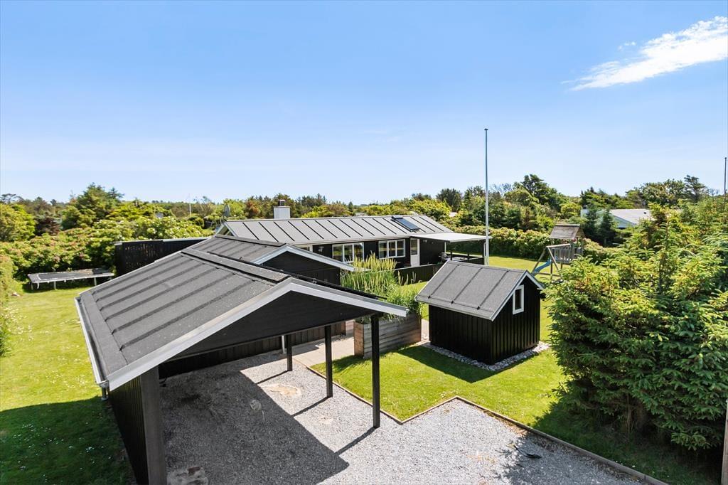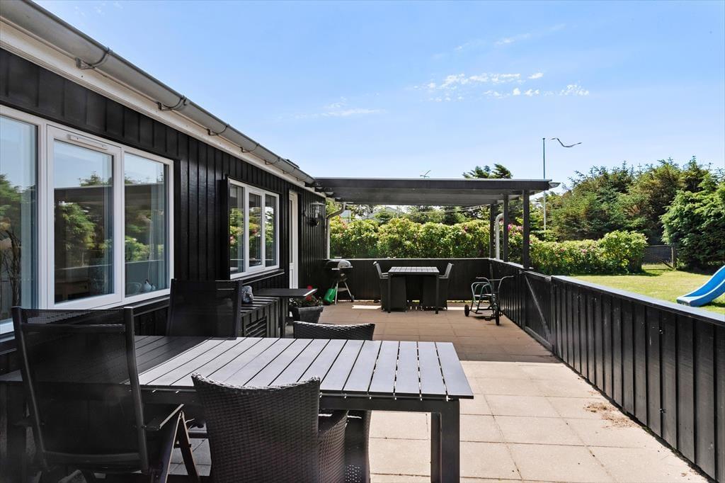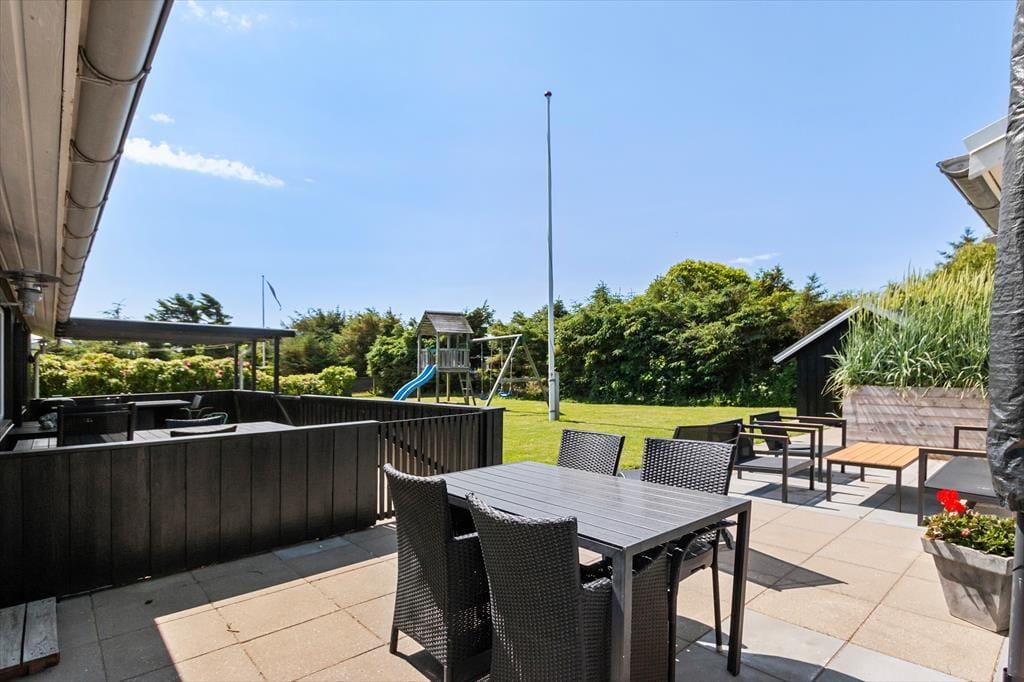 Huset har en flot og velholdt havegrund med masser af plads til boldspil og udendørs leg. Foruden gynge og sandkasse er her en flot legeborg i træ til børnene. Stor og helt aflukket terrasse med mulighed for sol hele dagen. Grunden er omkranset af høje træer og randbeplantning, som giver god læ og gør det muligt at opholde sig ugeneret ved huset.
